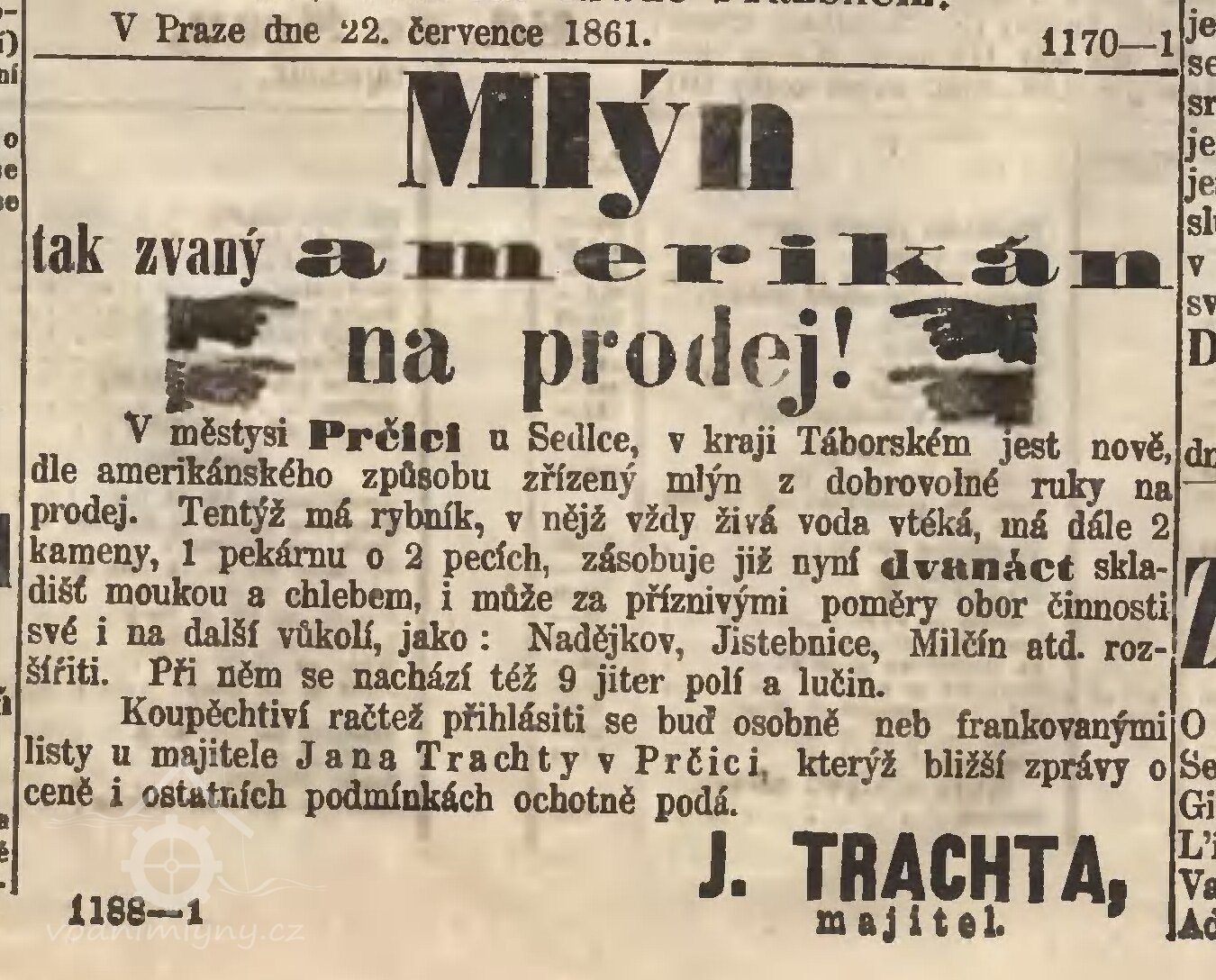 1764 od Jana Víta Malovce z Malovic pána na Prčici a Uhřicích koupil Jan Sova, mlýn měl 1 složení se stoupou