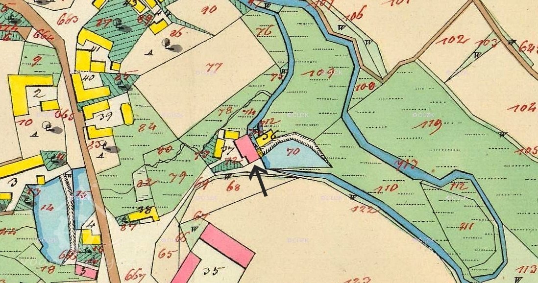Roku 1930 zde byla tři vodní kola na svrchní vodu: průtok 285 l/s; spád 4,05 m; výkon 9,78 HP.