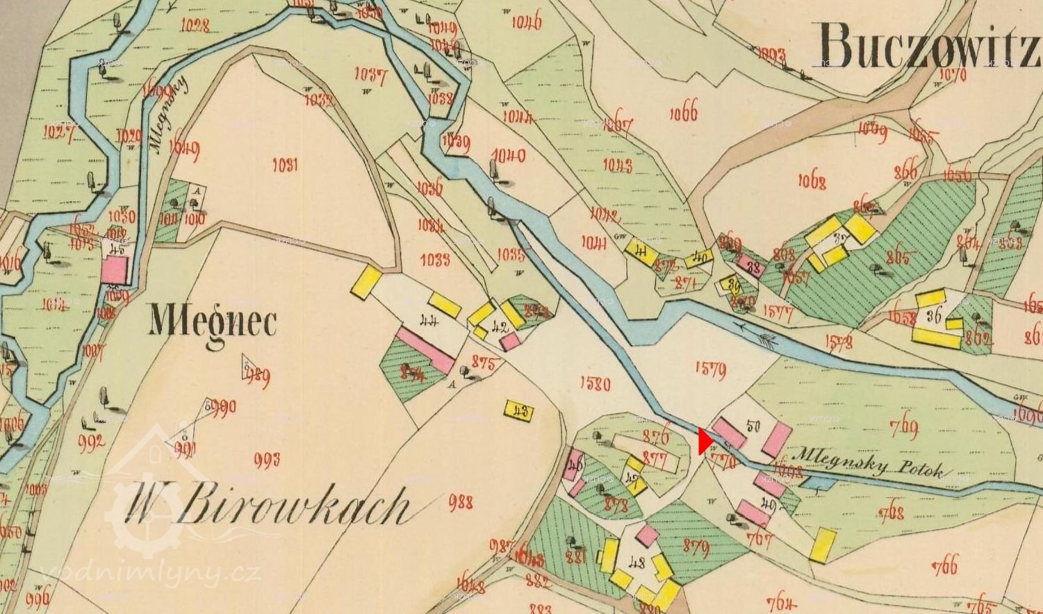 Ve vesnickém stavení, ležícím uprostřed obce Bučovice by většina nehledala mlýn. Přesto zde mlýn byl již v druhé polovině 17. století. Jméno dostal po jednom z mlynářů, kterých se zde však vystřídalo mnoho. Kdy skončil mlýn provoz není známo. V současnosti je opravován a upravován k bydlení.