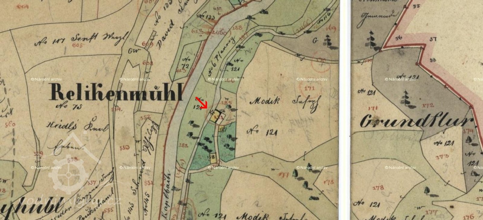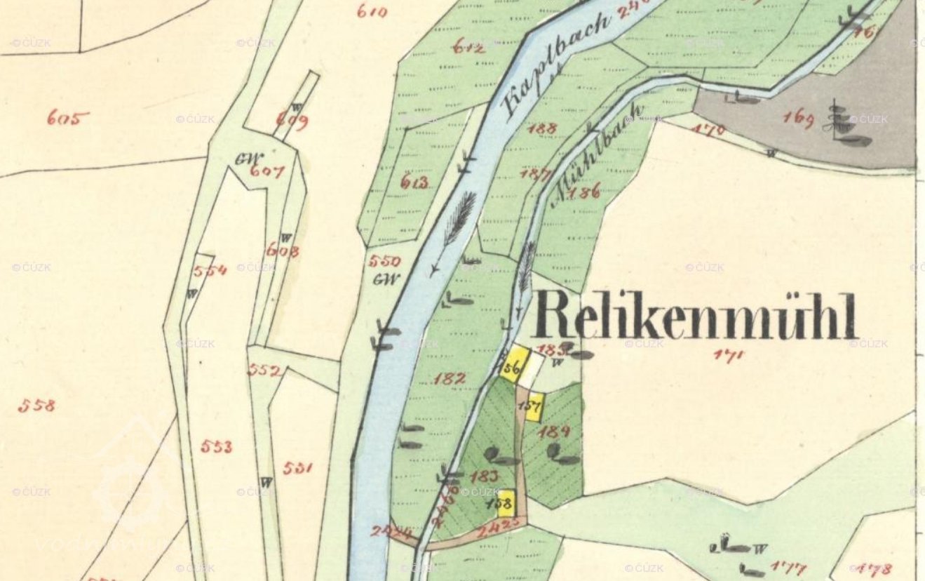 1654 Berní rula: chalupník Matěj Relík, vlastní mlejn s 1 kolem, 10 str. rolí, 6 ks. hov. dobytka, 1 ovce