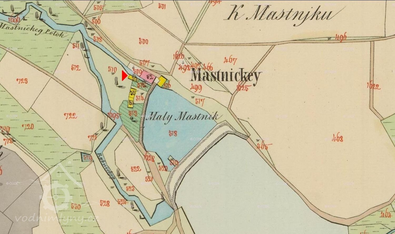 Při posledním provozu přicházela voda kamennou rourou v hrázi z rybníku Velký Mastník do rybníku Malý Mastník. V hrází tohoto rybníku byla opět roura. Před ní česla a stavidlo. Voda pak šla rovnou na Francisovu turbínu. Použitá voda odcházela zpět do potoka Mastníku