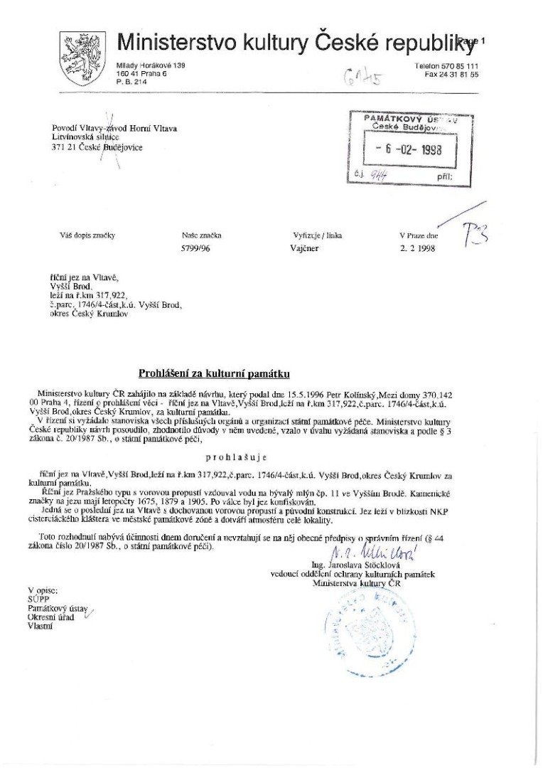 Jedná se o poslední jez na Vltavě s dochovanou vorovou propustí a původní konstrukcí. Kamenické značky na jezu mají letopočty 1675, 1879, 1905.