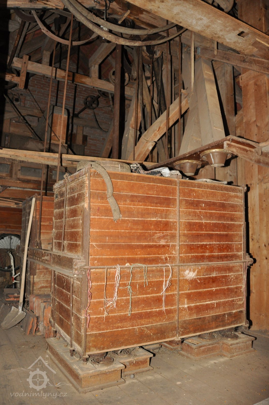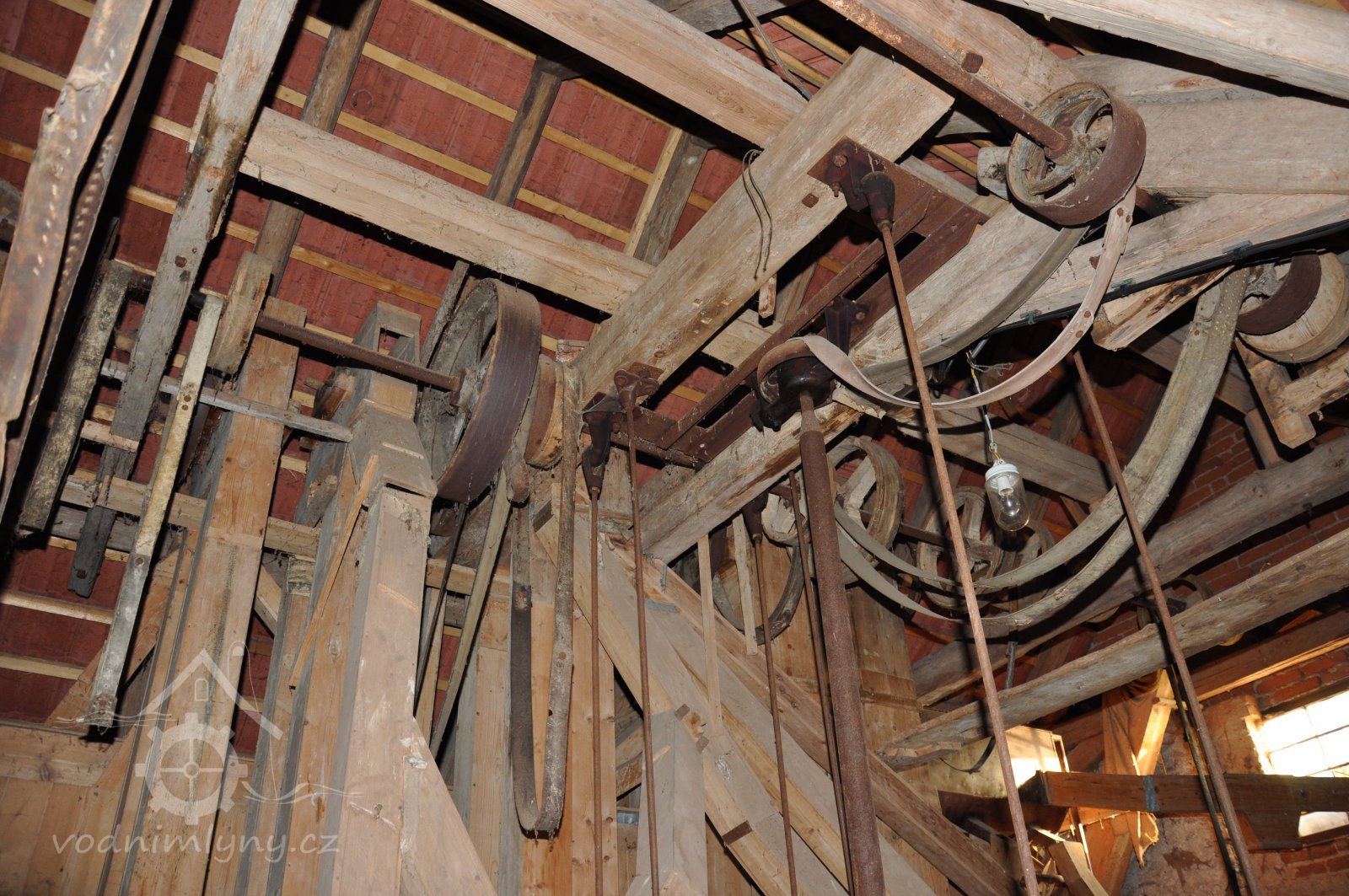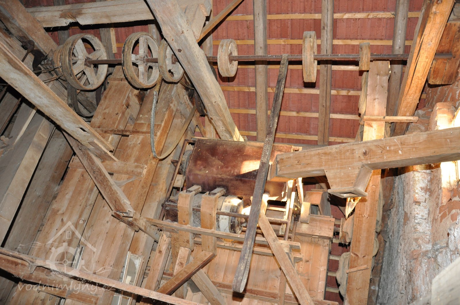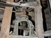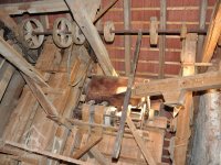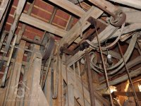 pohonná hřídel a lehčení s regulací kamenného mlecího složení, 2016, © David Veverka, (Prvky na obrázku: transmise, řemenice, převody)