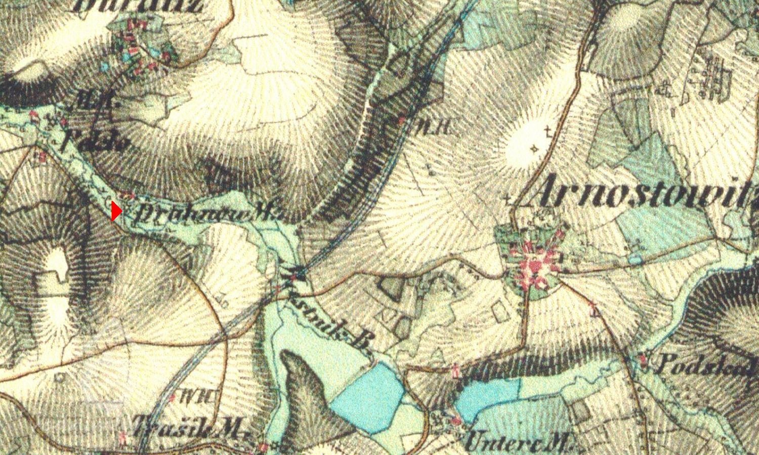 Nedaleko železniční trati z Heřmaniček na Prahu je vlevo mezi stromy skryt mlýn Drahnov. Hned od železniční trati kroutí se k němu v nesčetných záhybech náhon, který tvoří s Mastníkem 1 km dlouhý, stromovím zarostlý ostrov. V matrikách fary Arnoštovice jsou průkazné zápisy již od roku 1656. Provoz mlýna je zdokumentován ještě v třicátých letech minulého století. V současnosti je mlýn přestavován, ale úpravy nezasáhly mlýnici.