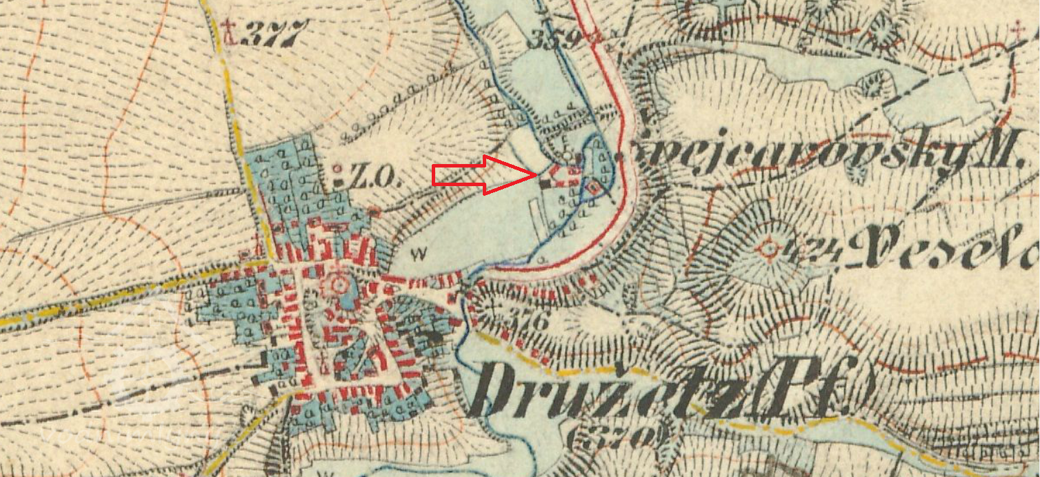 V ulici Hlavní 43, Družec stojí mlýn doložený již k roku 1616, kdy jej vlastnil Lazar Švejcar. Mlýn byl v držení rodu Švejcarů až do roku 1849, kdy jen Antonín Švejcar prodal za 19 000 zlatých Karlu Párysovi z Prahy a sám se přestěhoval do Bratkovic. Karel Párys mlýn zadlužil a musel být prodán v exekuční dražbě. Roku 1858 mlýn koupil František Štiller, který se sem přestěhoval z Ryšína u Rakovníka a roku 1855 zakoupil i Nový mlýn. Nový mlýn následně prodal. Roku 1872 František Štiller mlýn rozdělil na dvě usedlosti - č.p. 43 a 86, původní dvůr byl přepažen zdí. K č.p. 43 připadla stodola před mlýnem, mlýn s obytným stavením, pila, polovina hospodářského stavení vlevo od vchodu a pozemek, na němž bylo mnohem později zřízeno koupaliště. K č.p. 86 připadlo obytné stavení z roku 1845, druhá polovina hospodářského stavení a všechny polnosti (přes 10 ha polí). Po rozdělení byla v pozadí dvora přistavěna nová zděná stodola, zřízen nový vjezd zadem okolo hospodářského dvora. Roku 1888 byl u vchodu postaven seník, který byl v roce 1966 zbořen. Č.p. 86 si ponechal František Štiller, č.p. 43 postoupil synu Eduardu Štillerovi. Roku 1877 František Štiller postoupil i č.p. 86 druhému synu Františkovi. Na konci 19. století Eduard Štiller prodal č.p. 43 bratru Františkovi z č.p. 86 a obě č.p. byla spojena zase v jednu usedlost. V roce 1916 František Štiller mlýn postoupil svému synu Eduardovi, číslo bylo opět rozděleno, neboť č.p. 86 bylo postoupeno synovci své manželky Františku Součkovi z Lidic, učiteli měšťanské školy v Kladně.