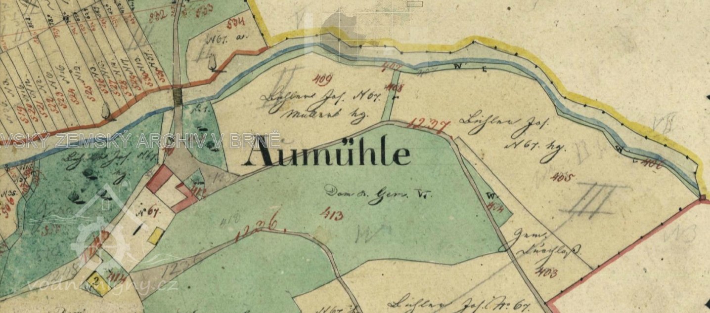 Loucký mlýn; Lauczke mlen, Aumühle, Auene Mühle, Aumena Mühle