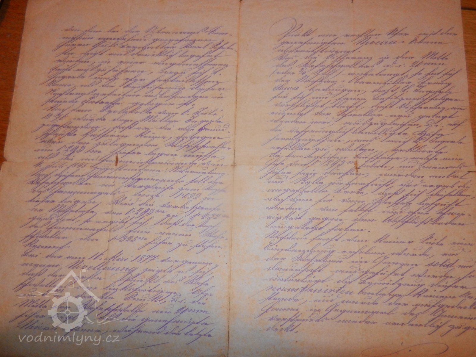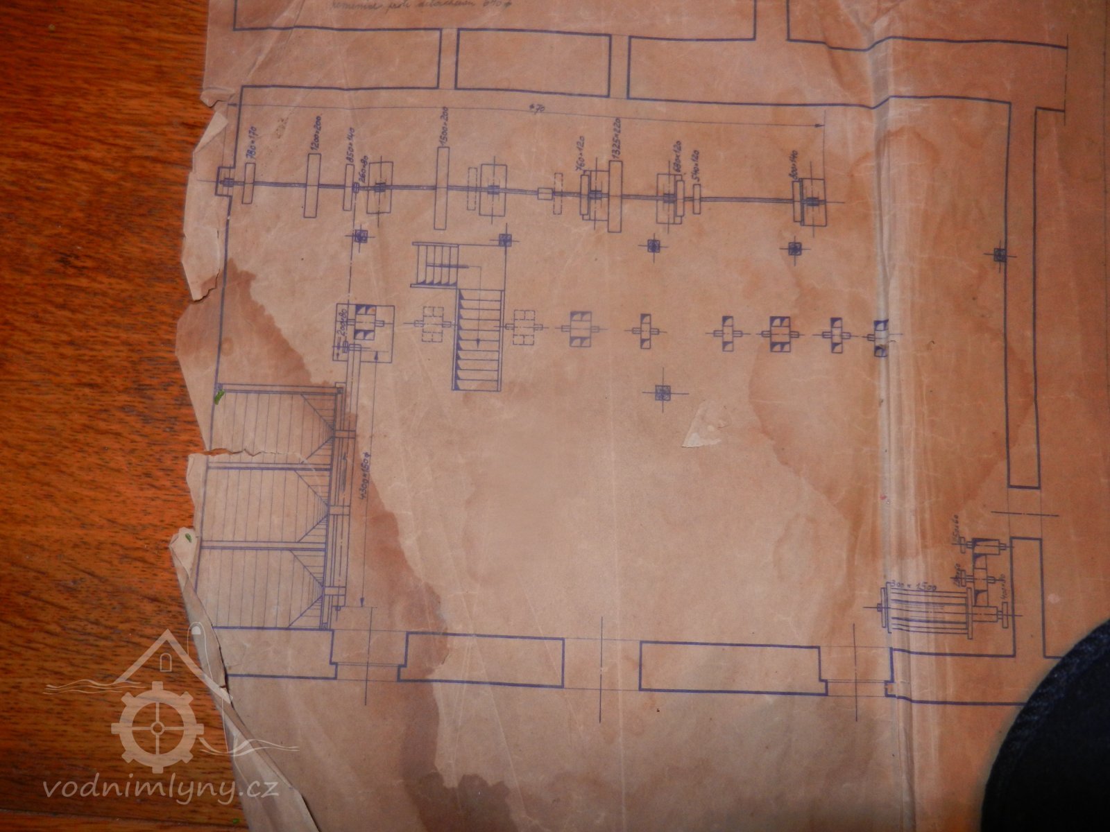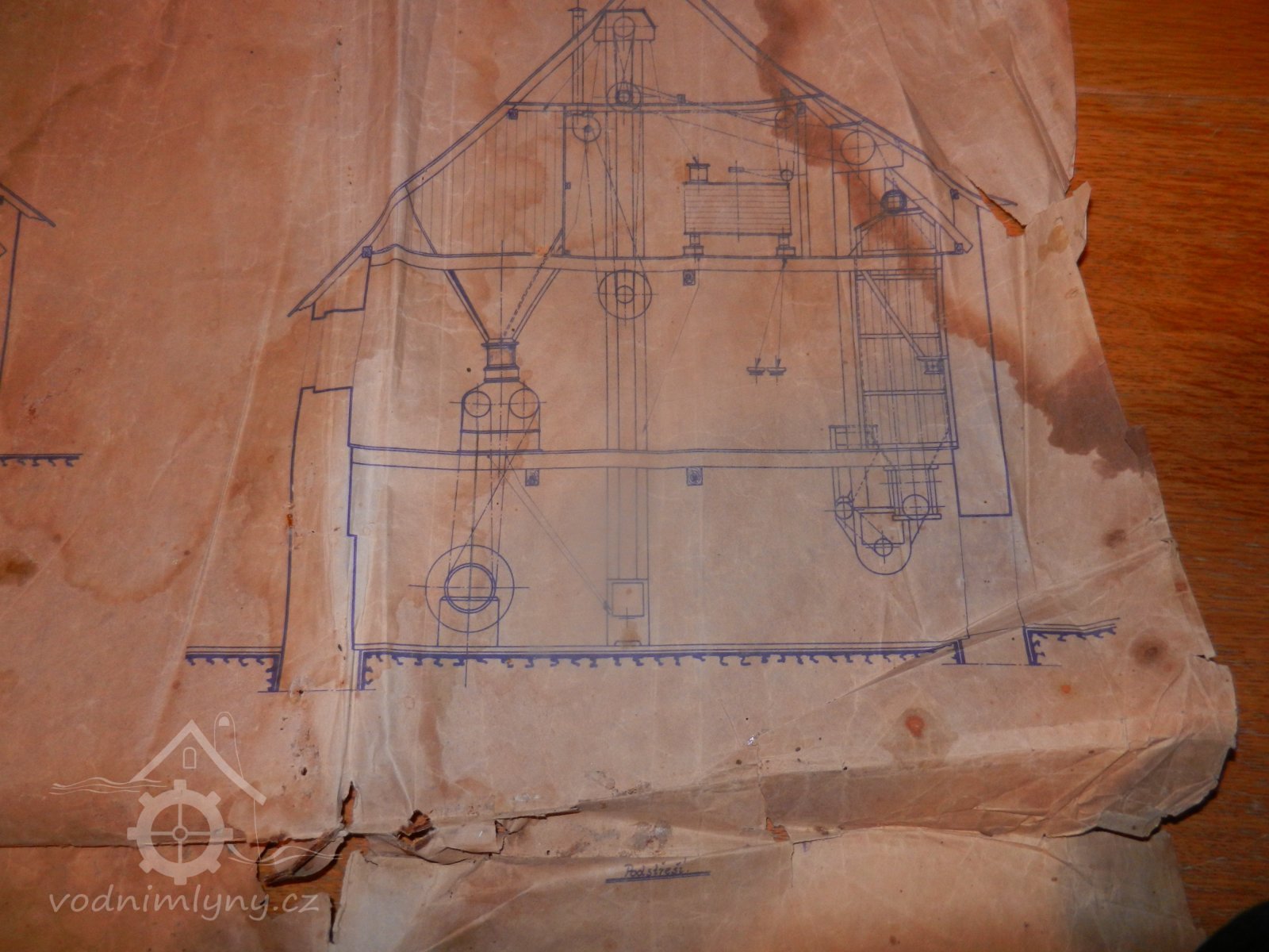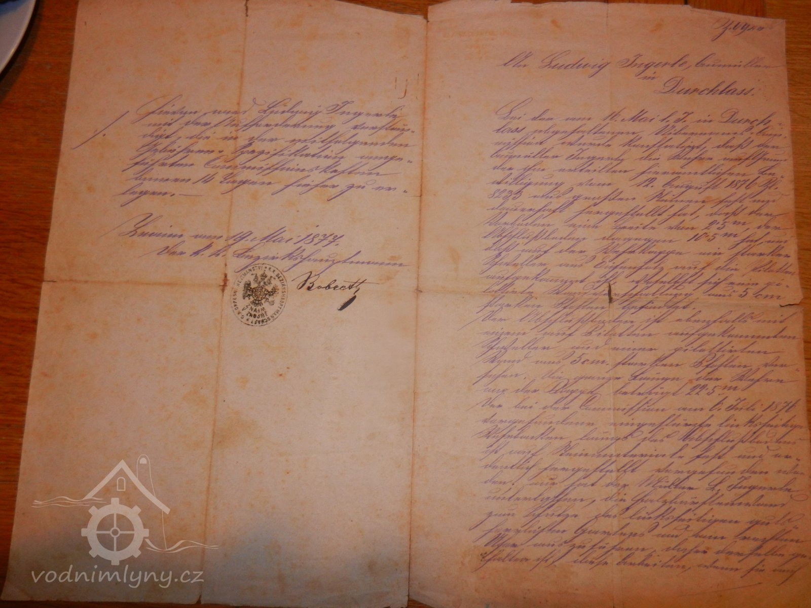 Jak jednak dle předložené žádosti a plánů, jednak dle výpovědi Vaší na místě samém zřejmo, zamýšlíte mlýn, jakož i vodní zařízení při mlýně podrobiti důkladné opravě. Za tím účelem bude první kolo 1m široké naraženo novým vodním kolem o průměru 4 m a 2.08 m v celku široké. Proto bude druhé stávající vodní kolo vůbec vypuštěno a veškeré zařízení mlýnské zřízenou pouze na pohon jedním vodím kolem.