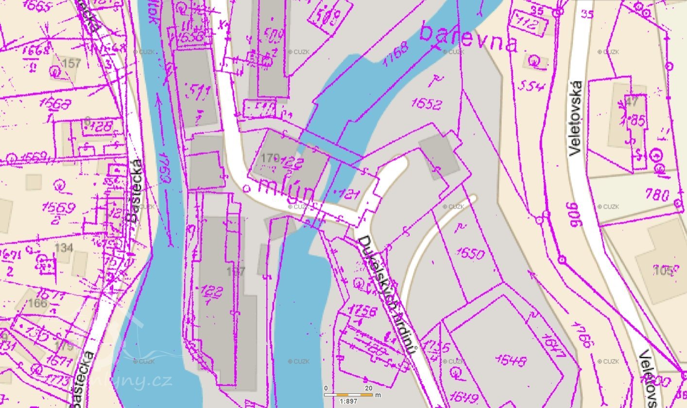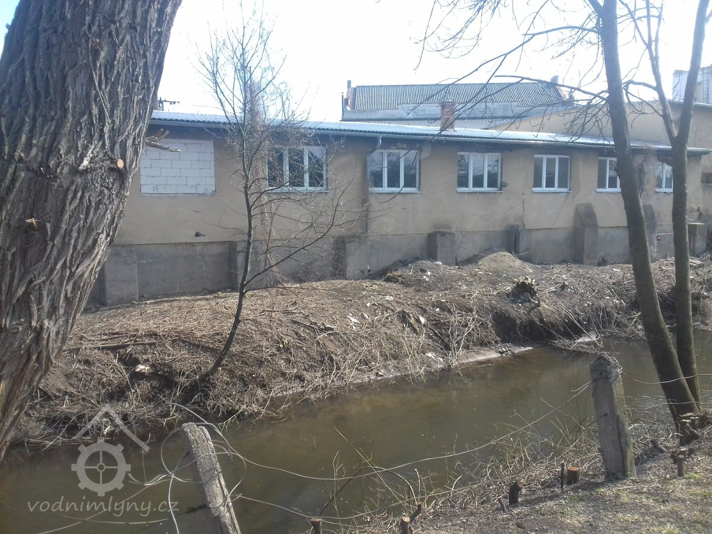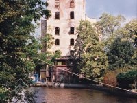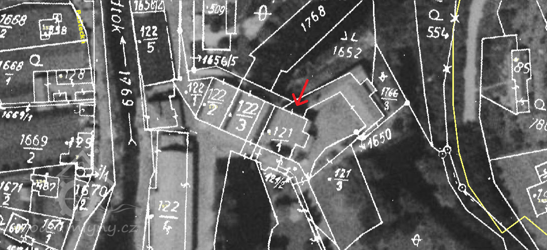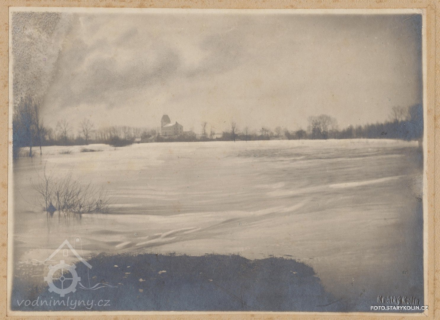 Fotografie přes vodní tok zachycuje komplex budov mlýna z opačné strany, náhony a kanály ho totiž obklopovaly z obou stran. Obrazy by pak byly malovány z břehu kanálu, kterému se říká Černá struha. Této poloze na obrazech odpovídá šíře toku, vysoké břehy, stromoví vlevo v pozadí na obraze Chalupy z NG i vzdálenost budov mlýna. Na místě stodol jsou dnes průmyslové objekty nejspíš z poválečné doby, kdy zde sídlil podnik Kara, které zakrývají i přímý pohled na mlýn.