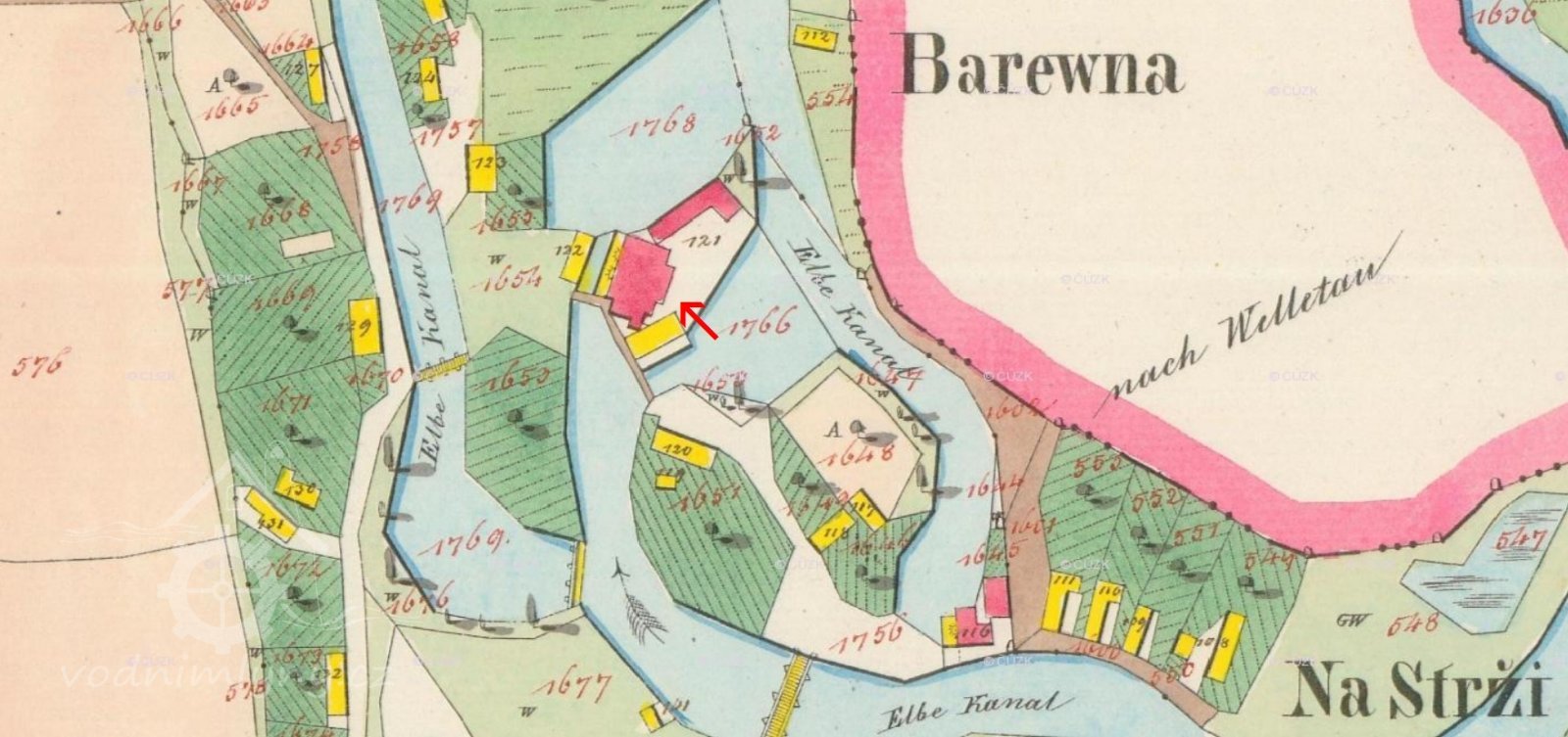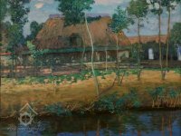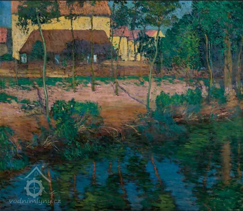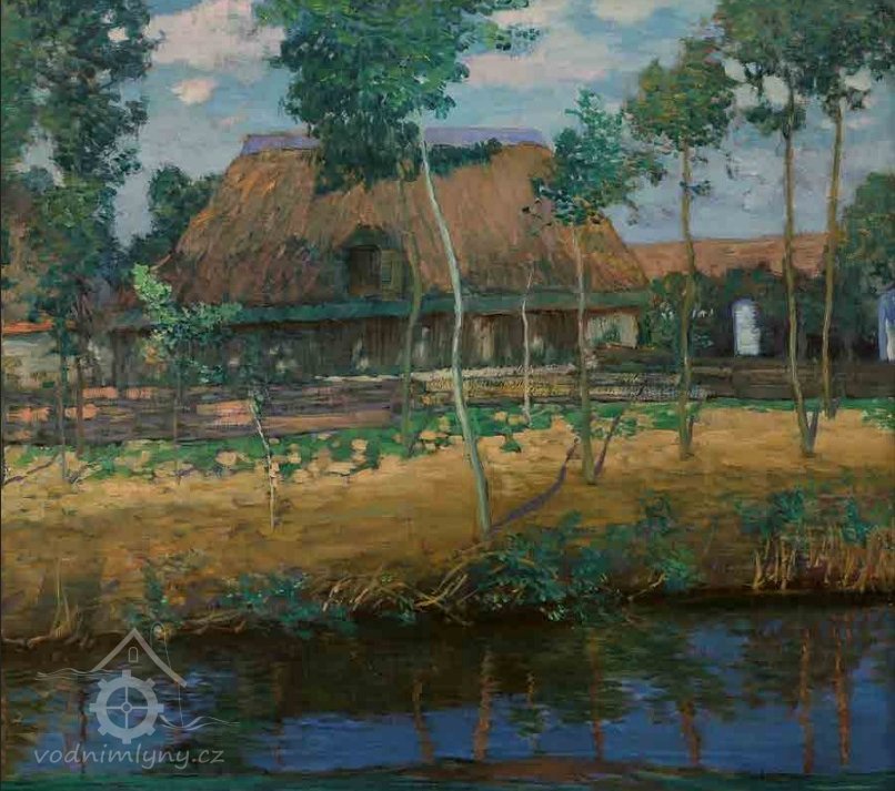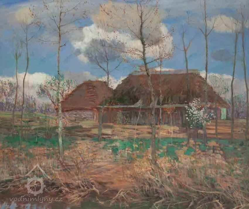 Ve sbírkách chebské galerie se nachází podmanivý olej Antonína Hudečka nazývaný v literatuře Chalupy nebo Chalupy u vody. Vyniká nápadnou expresívní barevností a energickým volnějším štětcovým rukopisem a donedávna byl vnímán jako spíše ojedinělý doklad malířova vývojového zrání po soustředěné okořské periodě. Když se před několika lety na aukci Dorothea objevilo rozměrné plátno s příbuzným námětem, nabídla se otázka podívat se na oba obrazy v aktuálním kontextu. Obraz z nynější soukromé sbírky není reprodukován v literatuře. Sám jsem ho znal od předchozího vlastníka, jímž byl Karel Lejnar z Velimi u Kolína. Měl jsem dokonce možnost si tehdy obraz svěsit a prohlédnout na světle, neboť visel jako jediný v samostatné místnosti, kam návštěvy nechodily. Bylo to někdy roku 1988. Lejnar měl malou, avšak vytříbenou rodinnou kolekci obrazů, z nichž vynikalo především krásné realistické plátno Mařákovo a metrový Štramberk od Panušky (dnes v OG v Jihlavě). Stýkal se s dr. Boučkovou, autorkou Hudečkových výstav, a paní Kobylákovou z tehdejší Středočeské galerie, která mu dávala tipy na obrazy, které byly galerii nabídnuty. Oproti chebskému obrazu, který má ještě zavedený okořský formát 80 × 90 cm, vyniká velké plátno jemnější osnovou tahů a apartnějším až gobelínově jemným povrchem. Soudím, že chebský obraz je jistě plenérový kus vyhotovený s udivující výrazovou intenzitou a jasnou polychromií odstínů, zatímco velký obraz bude ateliérový a ve výsledku více komponovaný, ovšem též vypracovaný a vyladěný. Záměrně užívám hudební výraz, neboť jakoby šlo o rapsodii v případě prvém a symfonii v případě druhém. Ludmila Karlíková připomíná ve své odeonské monografii roku 1983 tehdejší hudečkovský problém, totiž tendenci expresívní. Ta souvisela zčásti i s účinkem výstavy severoněmeckých malířů z kolonie Worpswede, kterou v Mánesu roku 1903 viděli Hudeček i Slavíček. Jejich letní malování ve Střítěži téhož roku tvoří tak pomyslný předěl mezi Okoří a Starým Kolínem v případě Hudečkově, respektive mezi Hostišovem a Kameničkami v případě Slavíčkově. Nejde samozřejmě o předěl mechanický, ale spíše o soustředěné vzrůstání vlivů přicházejících z nových výstav a cest. Obraz ze soukromé sbírky ve své až magistrální obřadnosti souzní s několika významnými okořskými obrazy (Podzimní nálada, 1900; Cesta na podzim, 1903), avšak motiv odpovídá starokolínské lokaci. Tam se Hudeček zaobíral daleko více charakterem místní zástavby, a to nejednou v pádných a i hutně malovaných obrazech návsi, souvislé řady domků, někdy s výraznou stafáží. Obrazy z roku 1906 povlovně přecházejí typově z děl okořských, v nichž se v letech 1905 – 1906 více zračila oproštěnost od levitujících secesních aranžmá a snaha o objektivizaci předmětné skutečnosti. Vylaďování oné subjektivní a objektivní polohy nápadně vyniká třeba již u Topolů, jejichž námět je střítěžský, ale Hudeček se k nim ještě i později vrátil. I prvá plátna ze Starého Kolína rezonují ve svém rzivém odstínu ještě s dumavostí Okoře, ale prokmitávání ostrých barev jako je ultramarínová modř či hutná veronesovská zeleň ohlašují již nový směr vývoje.