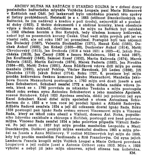 Mlýn na Baštách byl vystavěn asi až v letech 1560–1564. V roce 1910 jej zakoupil Vojtěch Loupal, nedlouho poté, v roce 1914, mlýn vyhořel. V letech 1914–1915 byl nově vystavěn vídeňskou pobočkou firmy Amme, Giesecke & Koenegen z Braunschweigu a zařízen na elektrický pohon. Vznikla zde mohutná vysoká čtyřpatrová budova s pětipatrovou věží, při mlýně byla zřízena hydroelektrárna s dvěma Francisovými turbínami, dodanými firmou J. M. Voith z rakouského St. Pöltenu. V roce 1928 mlýn opětně vyhořel. V roce 1930 zřídil majitel u mlýna továrničku na výrobu kyslíku pro potřeby průmyslu k autogennímu sváření. V roce 1937 se dostala firma do konkurzu a následujícího roku Vojtěch Loupal zemřel. V roce 1942 objekt koupil Jaroslav Kříž z Prahy, který v objektu mlýna zřídil moderně vybavené kožešnické dílny. V roce 1948 byl podnik znárodněn a zařazen do n. p. Kara, Praha. Následujícího roku vznikl samostatný podnik Kara Starý Kolín, který se v roce 1955 sloučil s podnikem v Trutnově. Dne 3. října 1999 objekt vlastního mlýna vyhořel a následně byl zbourán. Dochovala se přilehlá hydroelektrárna, nevyužívaná od roku 1976, a několik dalších menších objektů.
