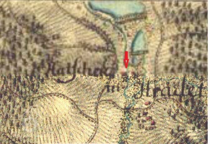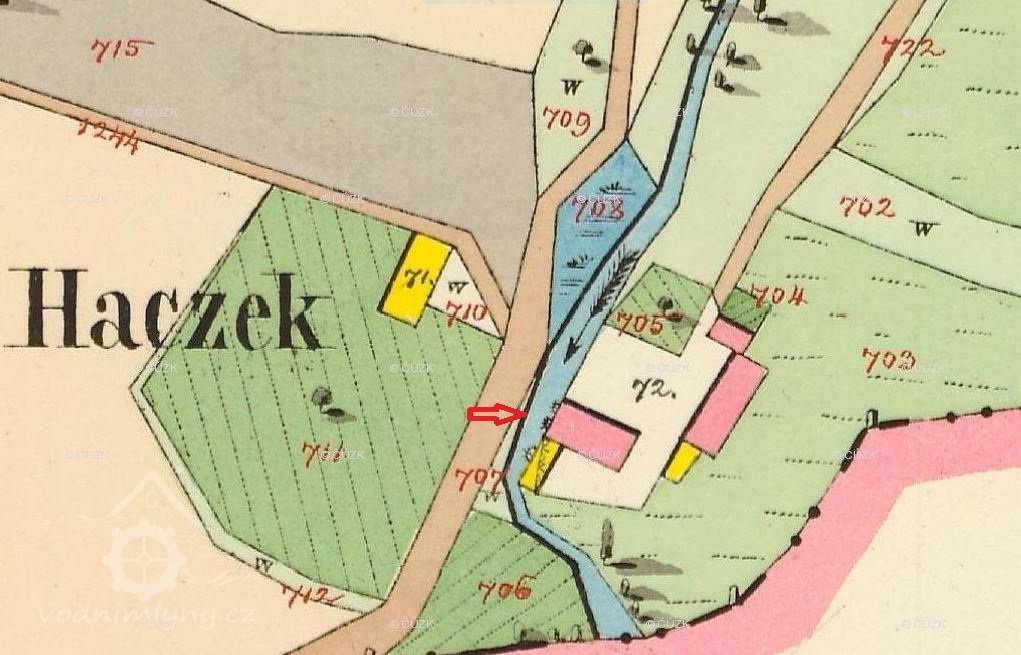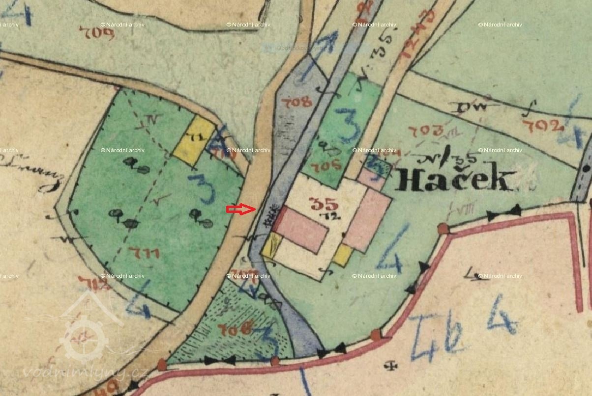 V roce 1677 je zmiňován mlýn s pilou Jakuba Hačeckého „kterejž bejval o dvou kolách nebo strojích mlejnských a stoupy se kolem mlejnským táhly. Vody tok svobodný i na pilu z rybníka panského Dlouhého Hačeckého“.
