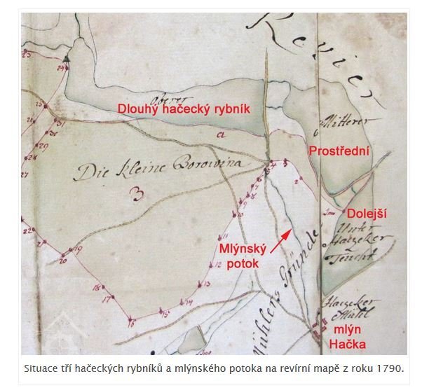 Již v urbáři černokosteleckého panství z roku 1677, tzv. Zlaté knize, je zmiňována jalová trouba, později přesněji nazývaná Mlýnský potok, kterou se na mlýn a pilu „od starodávna“ přiváděla voda z Dlouhého hačeckého rybníka. Tato strouha měřila téměř 1,5 kilometru a vodou zásobovala malou retenční nádrž nad mlýnem.