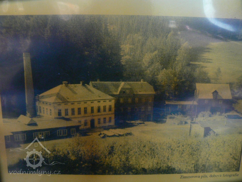 Zimmerova pila byla také nazývána Dolní mlýn (Niedermühle), neboť byla poslední ze čtyř mlýnů v osadě Hemmhübel (dnes Kopec). Původní mlýn se připomíná již v 16. století. Mlýn zde pracoval do začátku 18. století, později fungovala již jen pila. Po roce 1919 byl celý objekt rozšířen a zároveň došlo k zakrytí potoka (dnes ještě patrný tunel pod jezem), což obnášelo přemístění cca 2000 m3 zeminy. Ve dvacátém století vzrostl význam strojírenské výroby. Vyráběly se zde i větroně pro olympiádu v Berlíně v r. 1936 a firmě toto bylo zadáno jako známé a zavedené. Celou pilu rozstřílela a zkázu dokonala Československá lidová armáda v rámci vojenských cvičení mezi lety 1952-1957.