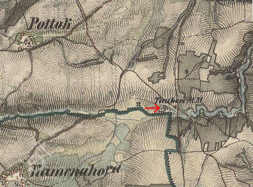 V roce 1839 byl na indikační skice a císařském otisku zobrazen mlýn jako budova ze spalitelného materiálu, jehož vodní kolo bylo poháněno vodou z náhonu a z mlýnské nádržky.