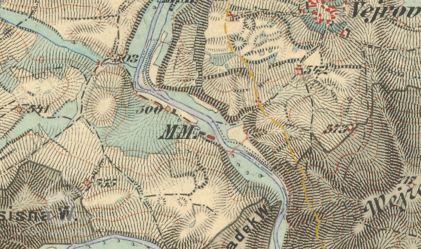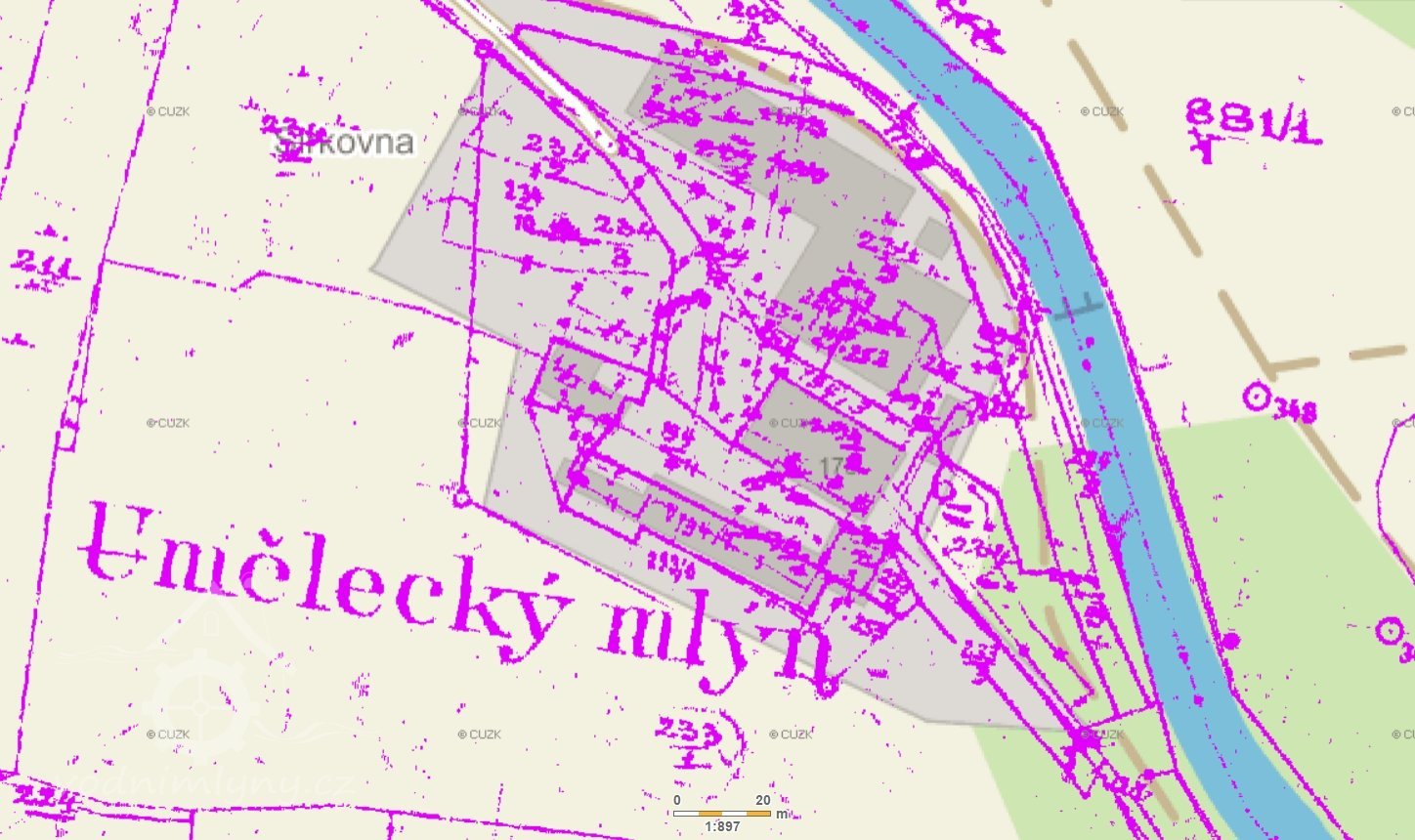 1900 stále veden jako umělecký mlýn, žije zde rodiny dozorce Karla Kühnela, Karla Turka, kočího ve mlýně a čeledína Vojtěcha Kahovce, chová se zde 14 ks. hov dobytka a 4 prasata