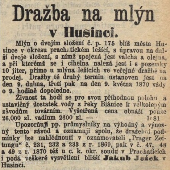 1924 převzala Občanská záložna v Prachaticích za 400.000 Kč (což byla zároveň hodnota dluhu), vodní síla a zařízení 200.000 Kč, nemovitosti 100.000 Kč, strojní zařízení 43.000 Kč atd.