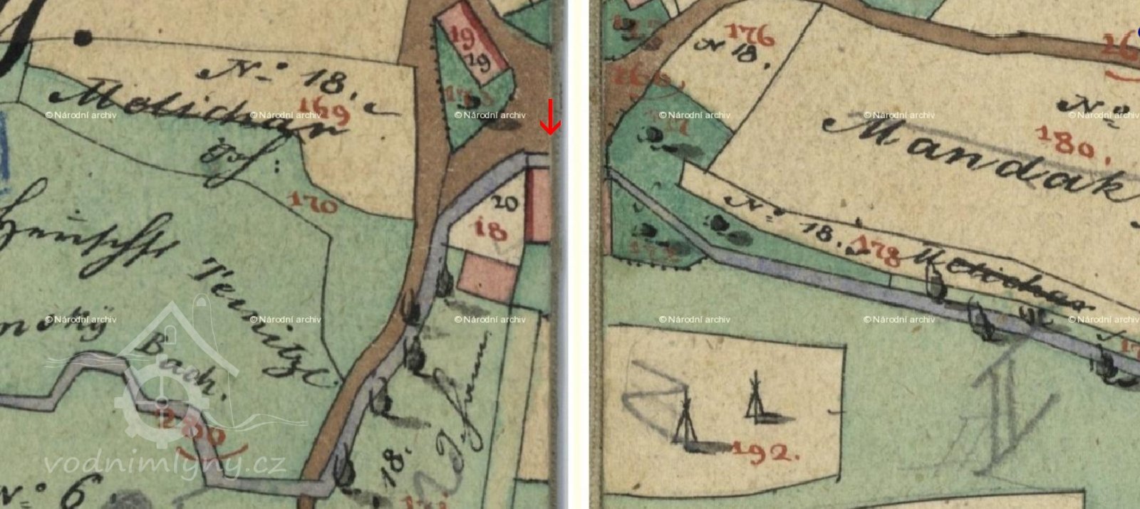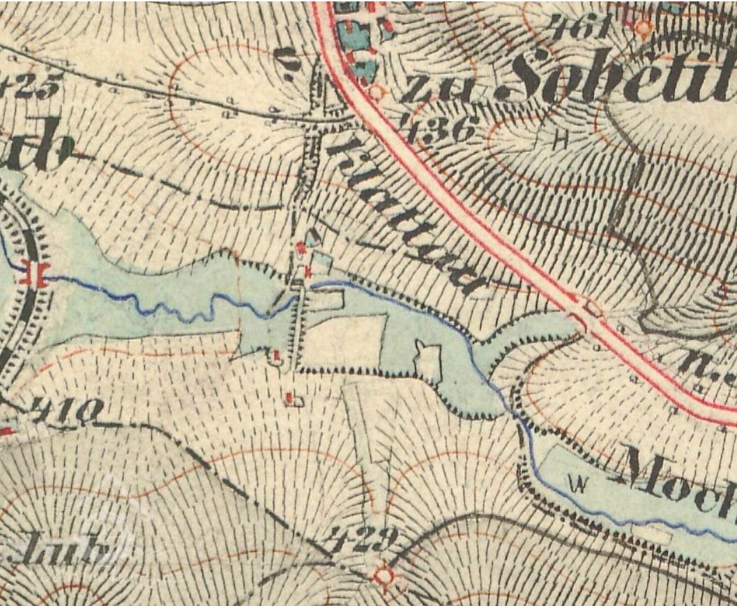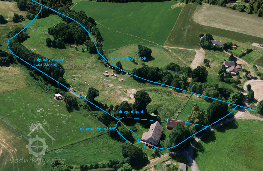 Voda v Mochtínském potoce byla vzdouvána jízkem o sv. šířce 1.50m a výšce 60cm, dřevěným, a naháněna jest do náhonu mlýnského. Celková délka náhonu od stavidla napouštěcího až ke mlýnu byla as 500m, šířka 2 až 4m, hloubka vody 30-40cm. Před vantrokami rozšiřoval se náhon v malou nádržku mlýnskou. Velikost byla as 8x14m, hloubka as průměrně 50cm, koruna hráze asi 40cm nad normální vodou. Vantroky byly betonové 60cm vysoké. Pokračováním vantrok betonových byl dřevěný žlab o světlé šířce 87cm a výšce 60cm. Stavidlo na kolo bylo 65cm široké a 50cm vysoké. Za stavidlem na kolo byl dřevěný žlab na kolo, 2.40m dlouhý, 65cm široký, 30cm vysoký. V den měření bylo ve vantrokách na délku 4.70m vody 28cm vysoko a stavidlo na kolo bylo povytaženo 10cm nad prahem. 5.4.1933