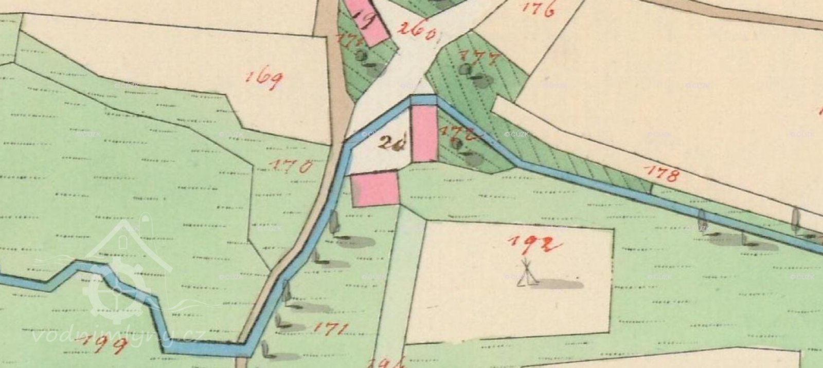 Popisv roce 1930 uváděno 1 vodní kolo na svrchní vodu, průtok 0,104 m3/s, spád 4,3 m, výkon vodního díla 4 k.s.