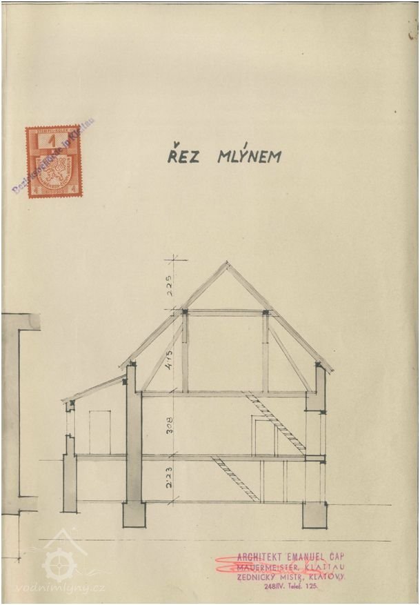 Hlavní mlýnská budova 19m dlouhá, dvoupatrová, 9m široká, 11.50m vysoká, zděná, v části 8m je mlýn, na zbytku 11m x 9m jsou v přízemí kuchyně a chlév a v prvním patře 7.50 válcová podlaha a byty, v druhém patře, 11m podlaha ku mlýnu, 8m půda. Za mlýnem jest přístavba pro motor, dl. 8.40m, šíř. 3m, výš. 2,75m.