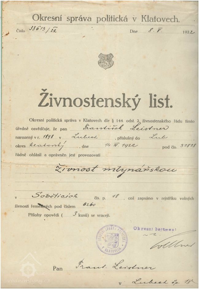 František je dle sčítacího operátu ze dne 17. února 1921 na mlýně veden jako schovanec a dílovedoucí, čili stárek, který v Soběticích žije od roku 1908. Ve smlouvě trhové a svatební ze dne 18. ledna 1922 je uvedeno, že František a jeho nastávající nevěsta Marie Šatrová (narozena 25. května 1894) vyplatí do svých oddavek Rosalii Pilmanové za mlýn obnos 16.000 Kč. Oba nastávající se stali novými vlastníky mlýna, každý na polovici. Mimo to, byli povinni nastávající manželé poskytovat Rosalii doživotní výminek a byt a sice: