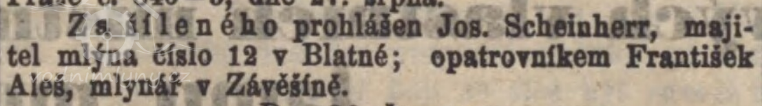 Mlynář Josef Scheinherr byl v r. 1874 prohlášen za šíleného. (RR)
