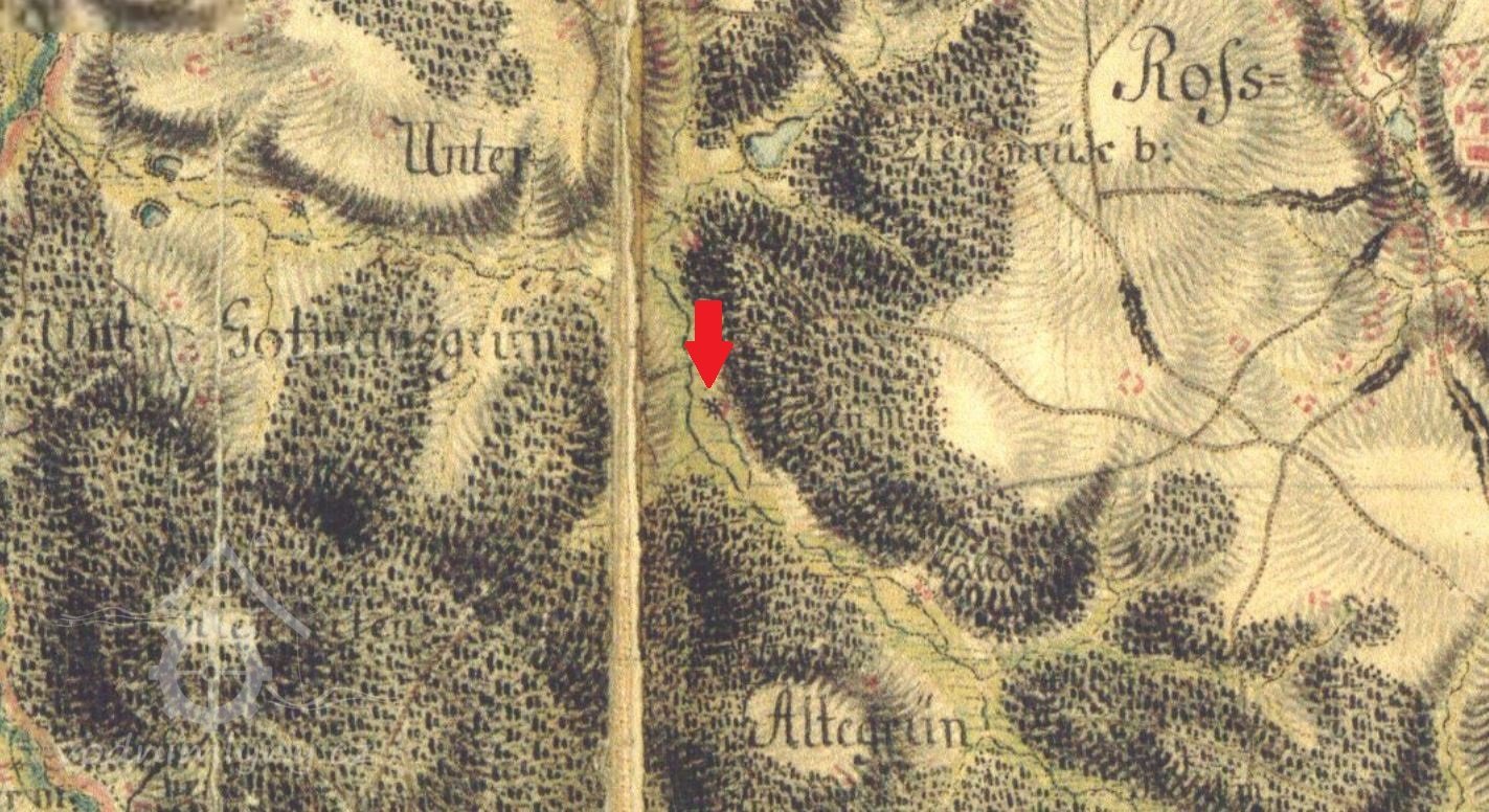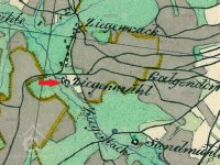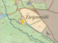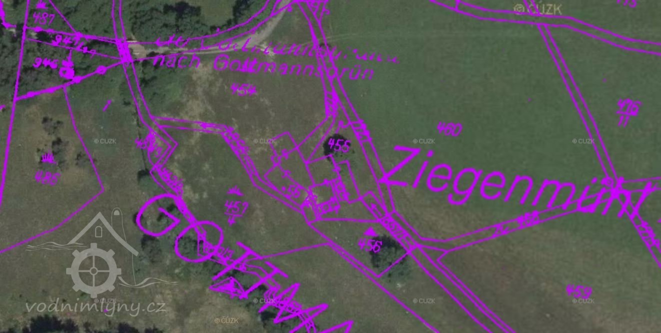 Obilní mlýn s pilou/katr a lísovnou oleje Johanna Jäckla čp. 53 v Gottmansgrün (Pastviny), takzvanný Ziegenmühle, na pravém břehu Regnitz (Rokytnice).