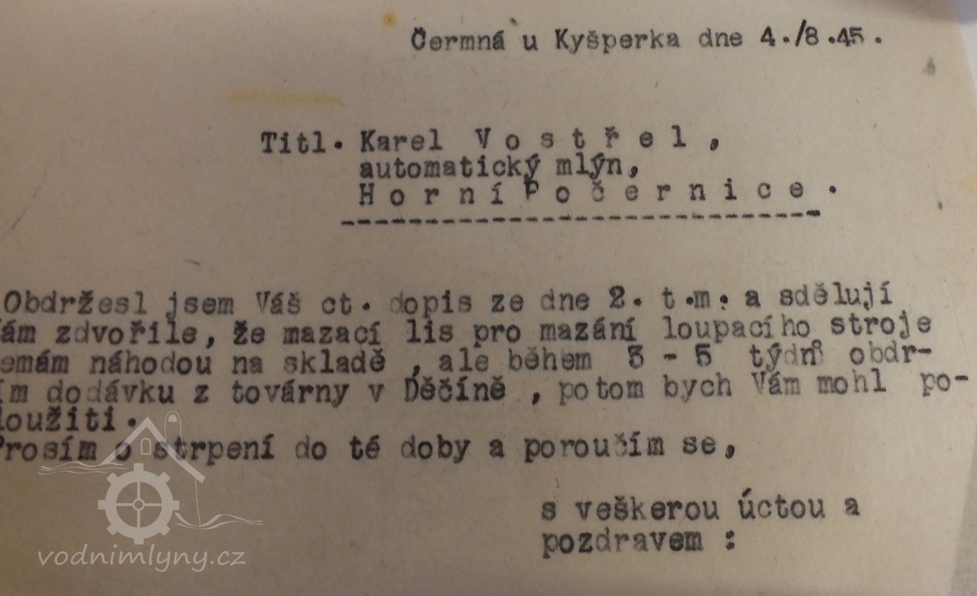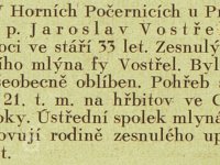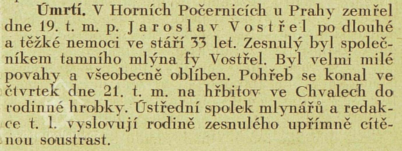 V časopise mlynář je oznámení o úmrtí teprve 33 let starého Jaroslava Vostřela. Další zmínky až do roku 1939 patří jménu Karel Vostřel, Horní Počernice. Karel byl často členem různých komisí. (RŠ)