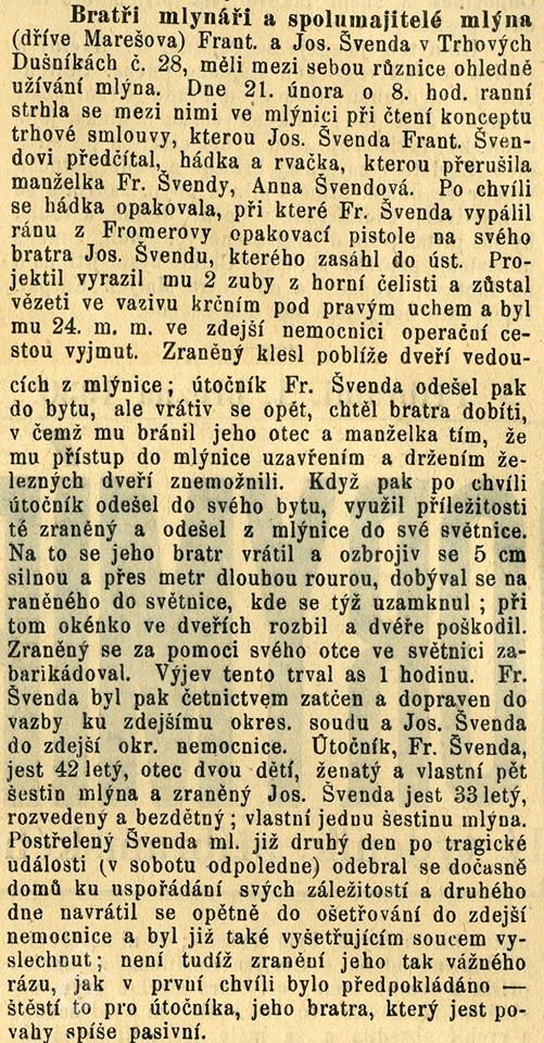 21.2.1930  spolumajitelé František a Josef Švenda, František Josefa v hádce postřelil