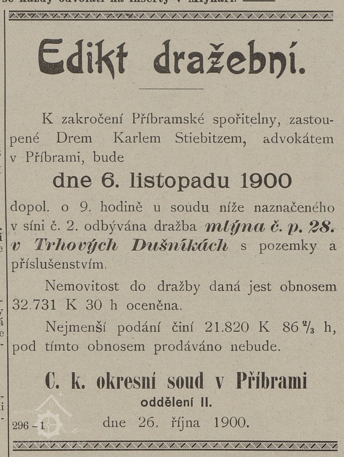 19. ledna 1877 byl mlýn prodán Josefu a Anně Váchovým. 7. listopadu 1900 byl na mlýně Petr Mareš, který jej koupil v exekuční dražbě a přestavěl pro svého syna Petra.