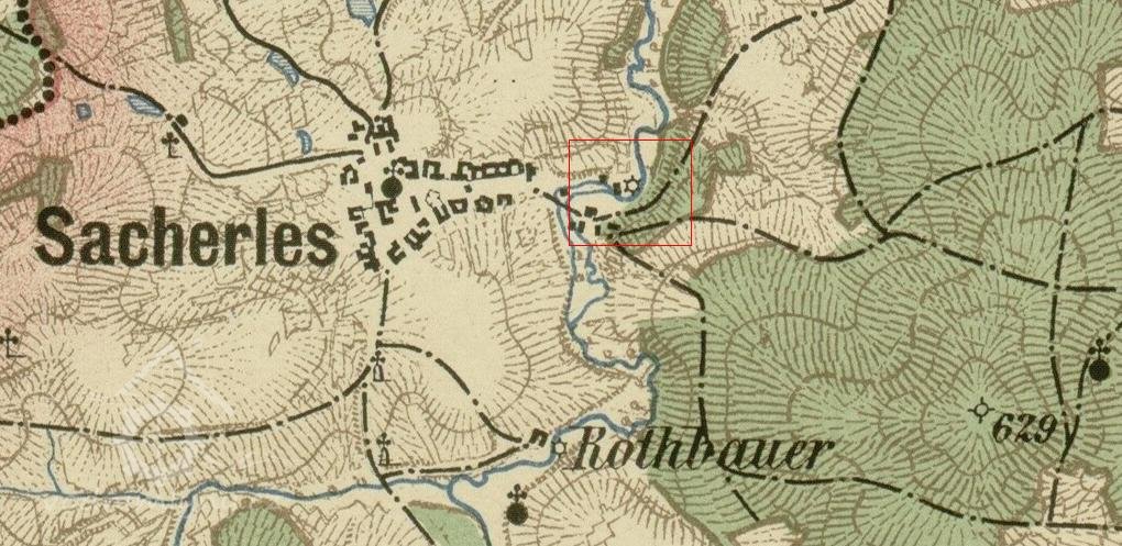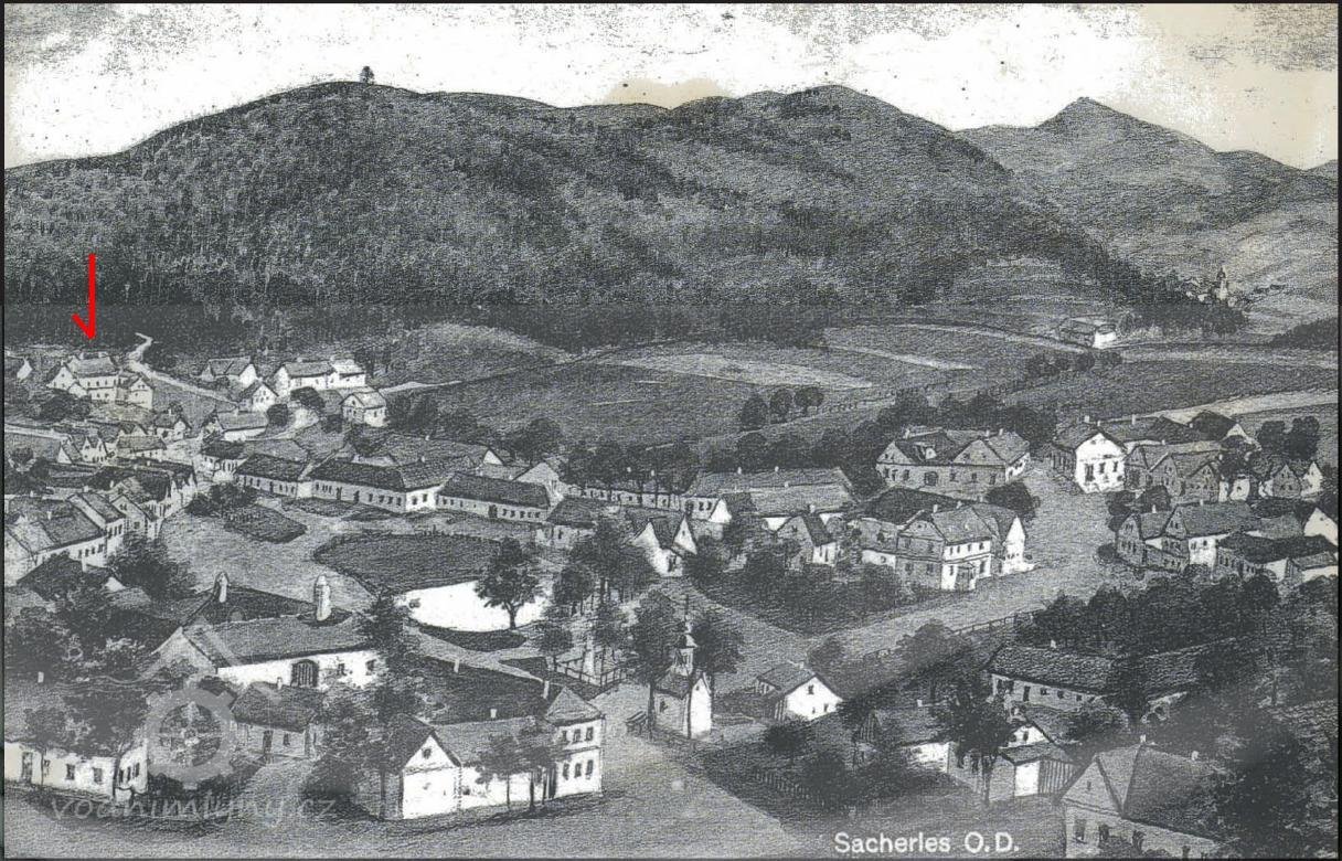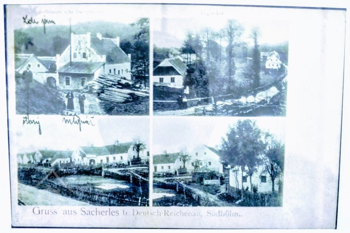 Sacherles Nr. 12, vlastníci Wolf Kaspar (*1878 Žár) u. Walburga W. (roz. Dacho, *1885 Rychnov u N.Hradů), v usedlosti 10 osob, Kaspar byl "Müller-Meister", manželka Walburga Wolf, 4 děti
