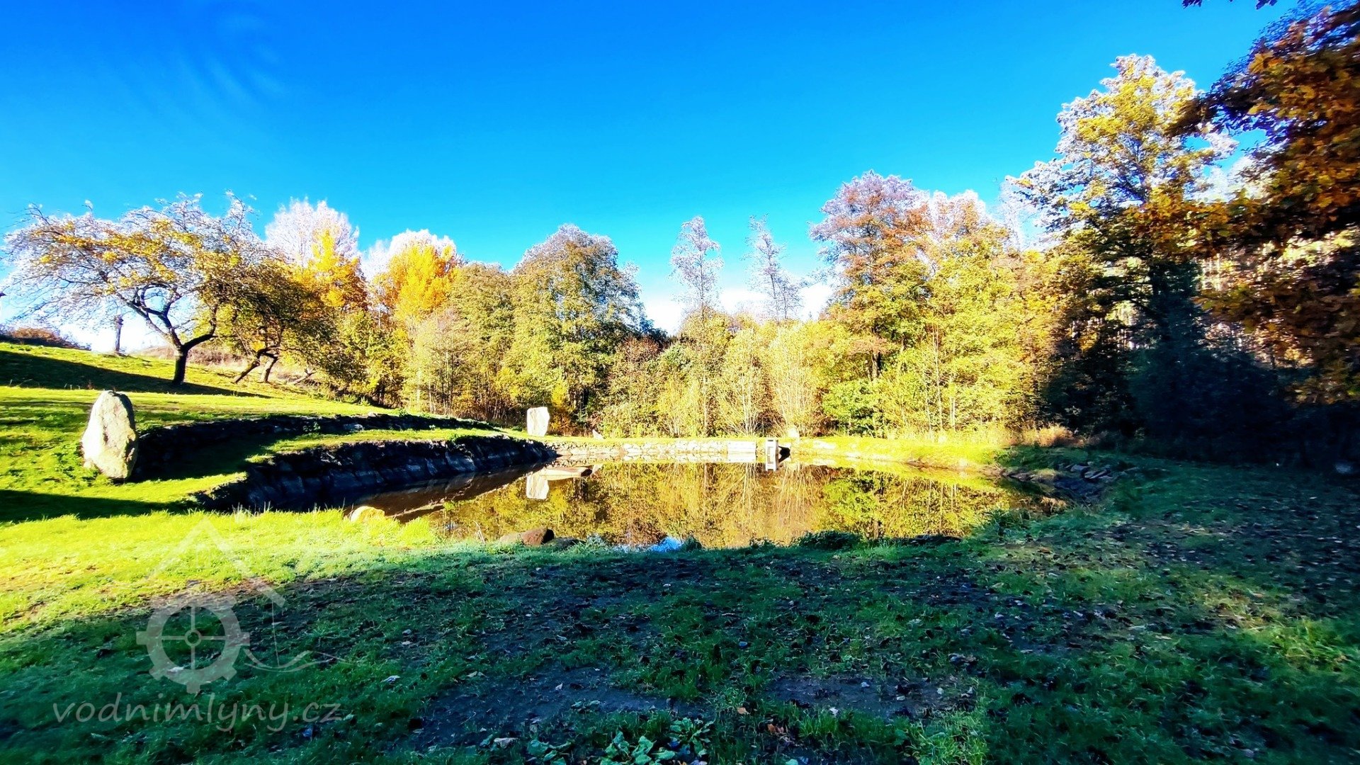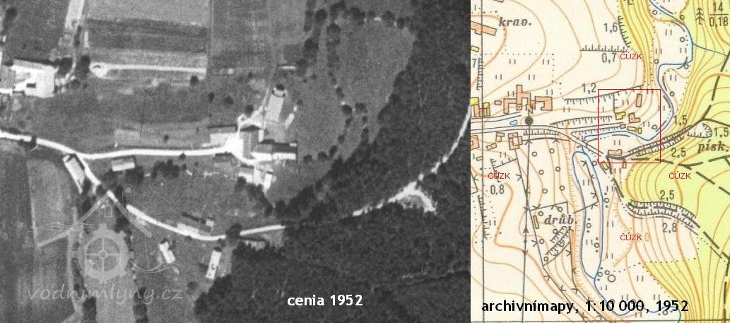 Náhon+odtokové kanály u mlýna zřejmě zasypány (kvůli extrémnímu počasí nebyl čas na detailní průzkum) - pův. situace jde vidět na otisku SK. Náhon se odpojoval J před obcí - v dnešní ZM10 stále vyznačen i když zřejmě jako suchý, před mlýnicí pokračoval ostře doprava nad dnešní přístupovou cestou, poté vedl jeden odt. kanál zpět do potoka ostře jižně od mlýnice, druhý SV směrem vpravo za mlýnem zpět do potoka.