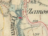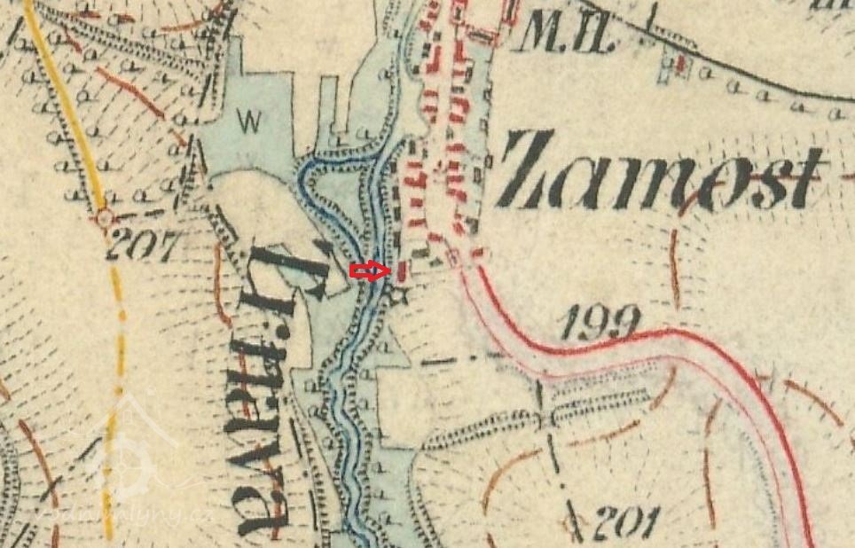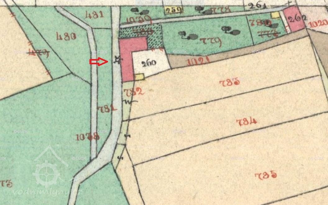 Dle stabilního katastru byl mlýn a okolní pozemky k němu patřící v roce 1842 v majetku obce Zámostí, mlynář byl nájemcem.