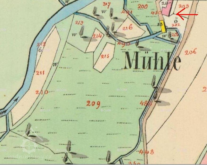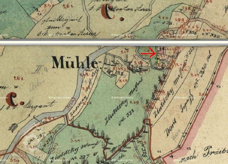 Mlýniště a pilu koupil roku 1763 od obce za 450 zlatých V. Šťastný, pak oboje vlastnil Antonín Havrlík, od roku 1793 jeho vdova Rozina, znovu provdaná Černá, a její syn Josef Havrlík. Po smrti paní Černé v roce 1806 připadly mlýniště i pila Vojtěchu Černému, v roce 1817 je zmiňována Rozina Chroustová.
