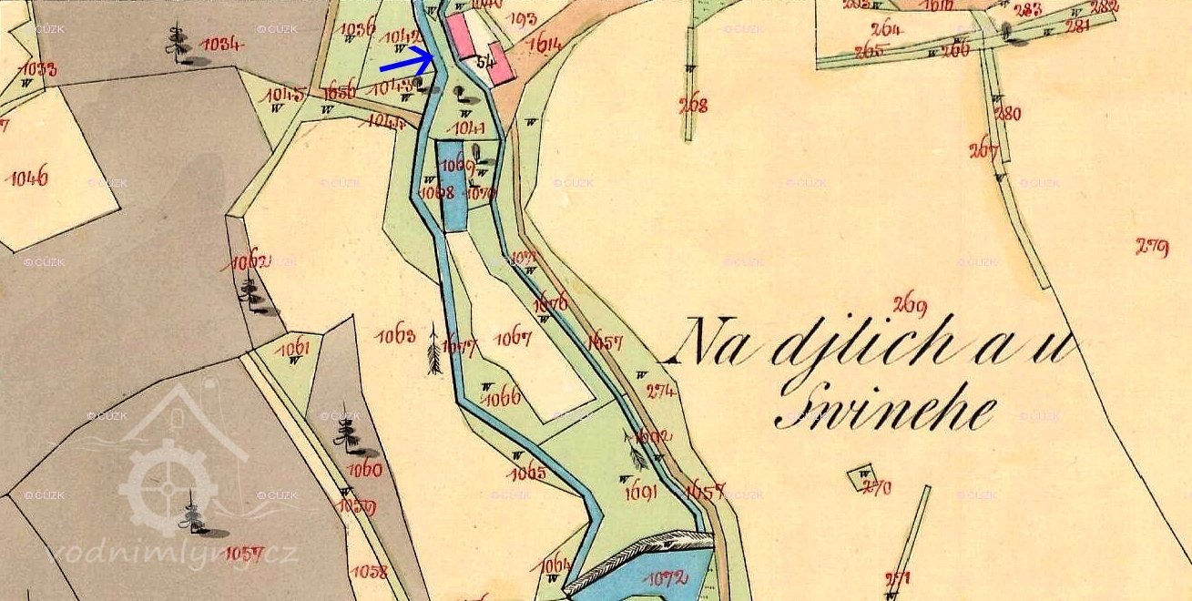 1930: 1 kolo na svrchní vodu, hltnost 0,103 m3/s, spád 5,05 m, výkon 4,5 HP