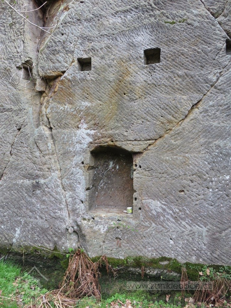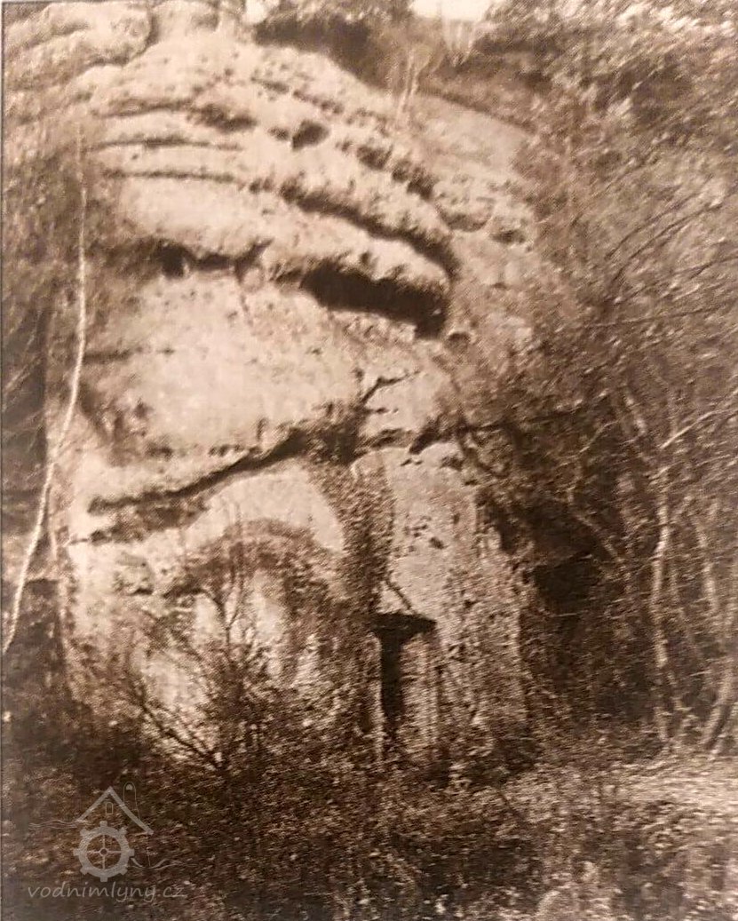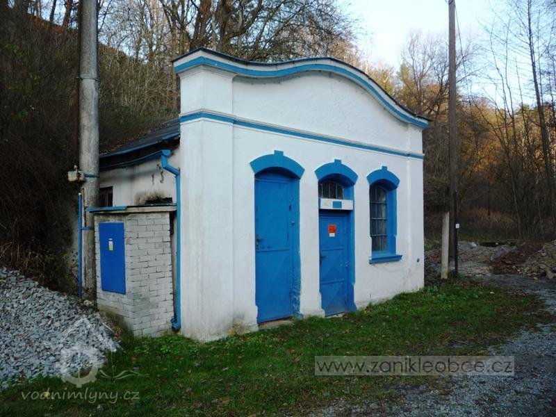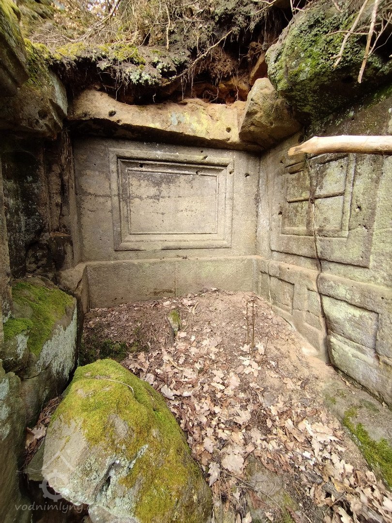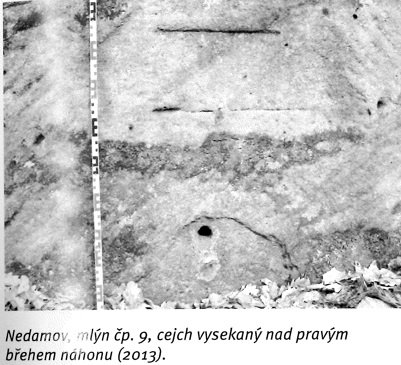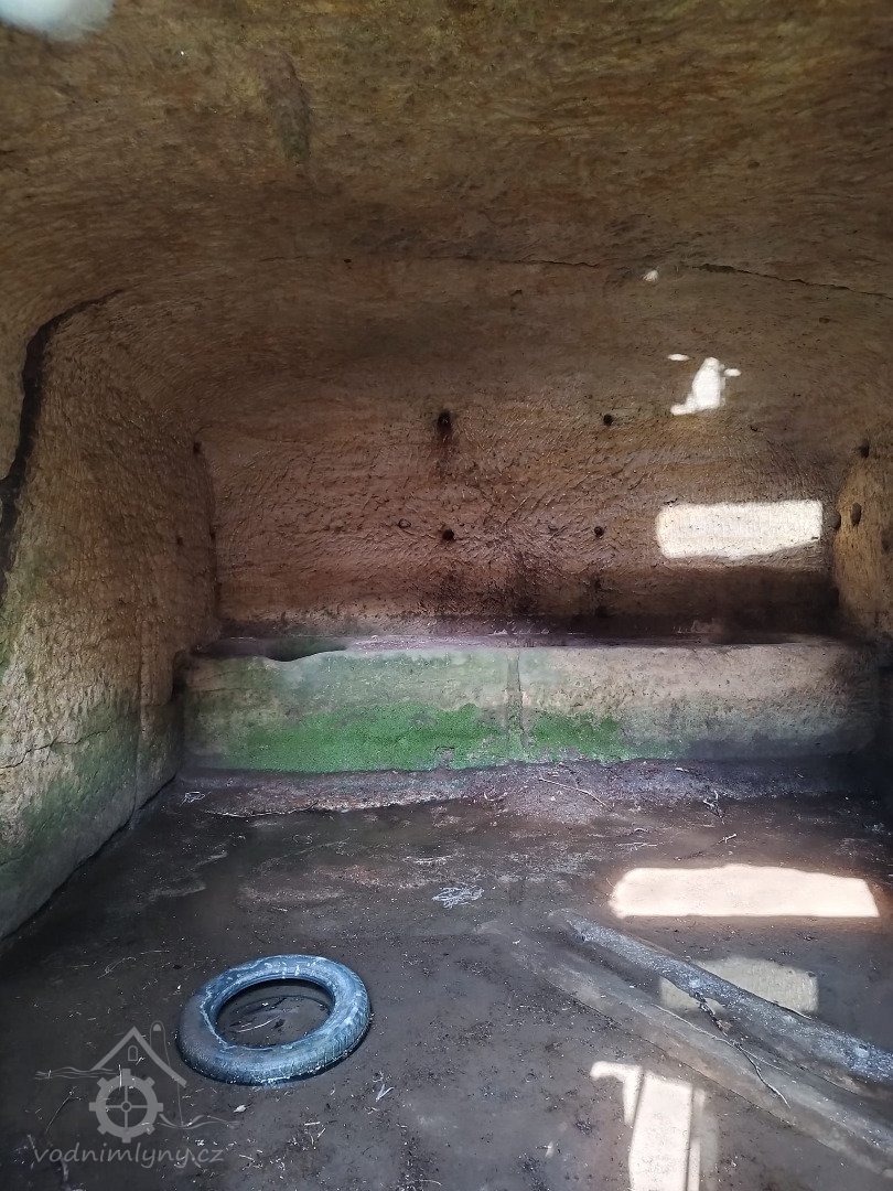 Vzadu, na konci náhonu vpravo, je místnůstka, sloužící jako akumulační nádržka, kde je vytesán kříž a dochovalo se slepé okno a výklenek, nejspíše pro svatý obrázek a sošku., 08 2011, © Vladimír Kraus, (Prvky na obrázku: náhon, akumulační nádržka)