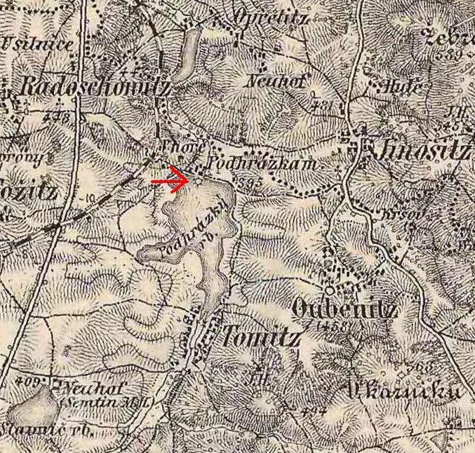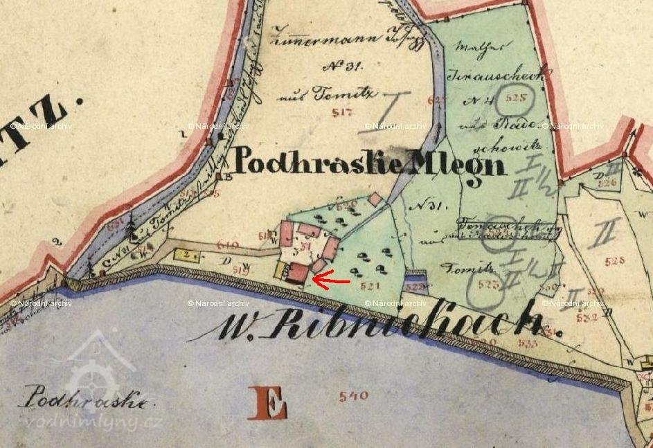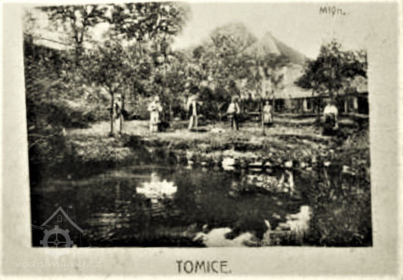 Mlýn byl postaven pod Podhrázským nebo také Velkým rybníkem v Tomicích ještě před I. vojenským mapováním /1764-68/. Indikační skica a císařský otisk z roku 1840 jej zobrazují jako velký zděný mlýn se dvěma vodními koly a s dalšími hospodářskými budovami. V roce 1840 byl majitelem mlýna čp.31 v Tomicích Josef Zimmerman.