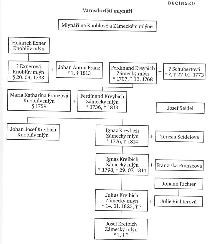 Mlynář Ferdinand Kreibich zemřel v prosinci roku 1768. Mlýn po něm vedla vdova, a to až do své smrti roku 1773. Po ní pak mlýn převzal její syn Ferdinand Kreibich mladší za 1 470 guldenů. Ten měl za manželku dceru Johanna Antona Franze, mlynáře z Dolního Podluží /jenž byl již od r. 1747 mlynářem na sousedním Dolním neboli Kočičím mlýně ve Varnsdorfu/. Mlynář Ferdinand Kreibich předal Zámecký mlýn 2. dubna 1800 svému druhému synovi Ignazu Kreibichovi. Po jeho smrti v roce 1813 převzal mlýn opět jeho syn, rovněž Ignaz Kreibich, s manželkou Terezií, rozenou Seidelovou. Tento mlynář zemřel roku 1814, a tak se jeho syn, opět Ignaz, stává novým vlastníkem Zámeckého mlýna. Tento mlynář Ignaz Kreibich zemřel roku 1848.
