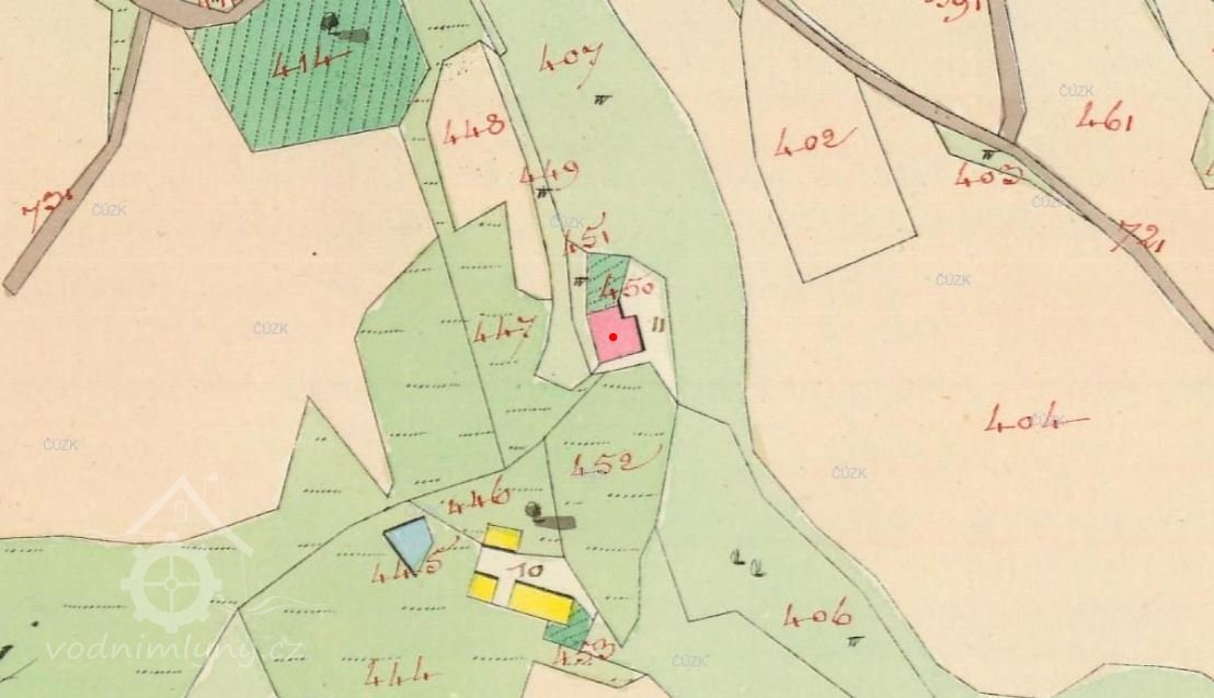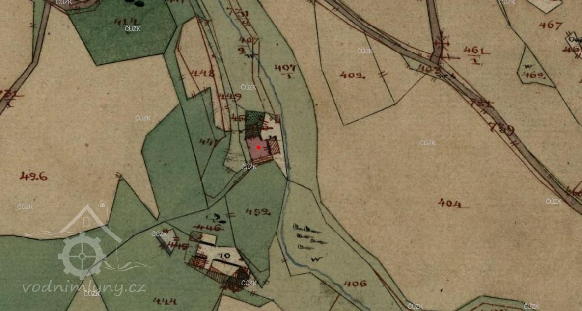 Užívání vody k provozování mlynářské živnosti. V roce 1880 zasazeno normální znamení... U mlýna nachází se nádržka s kamennou troubou ve hrázi uzavíranou stavídkem 35 cm širokým. Troubou se přivádí voda na mlýnská kola, ze kterých kolo pro hořejší složení má výšku 4,5 m, kolo pro dolejší složení 4,3 m a každé je 0,7 m široké...(další podrobnosti o technologii nejsou uvedeny)