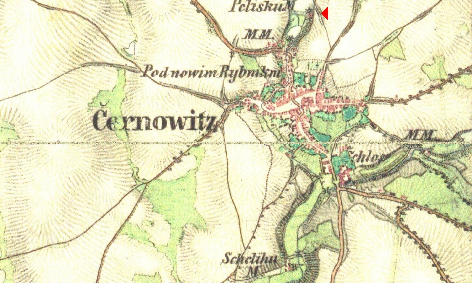 Dle protokolu ze dne 21.7.1897 č. 27758 nalétá se tento mlýn na vzniku černovického potoka při mlýnské nádržce č.parc.840 v Černovicích. Má jedno složení jenž se uvádí do pohybu vodním kolem o průměru 3 m a šířce 0,64 m na horní vodu. Stavítko závodní je 0,3 m široké a 0,26 m vysoké. U nádrže je jalový splav s 5 stavidly, z nichž první (počínaje od mlýna) má světlou šířku 1,2 m, druhé 1,2 m, třetí 1,3 m, čtvrté 1,26 m, páté 0,9 m, všechna jsou 0,36 m vysoká.