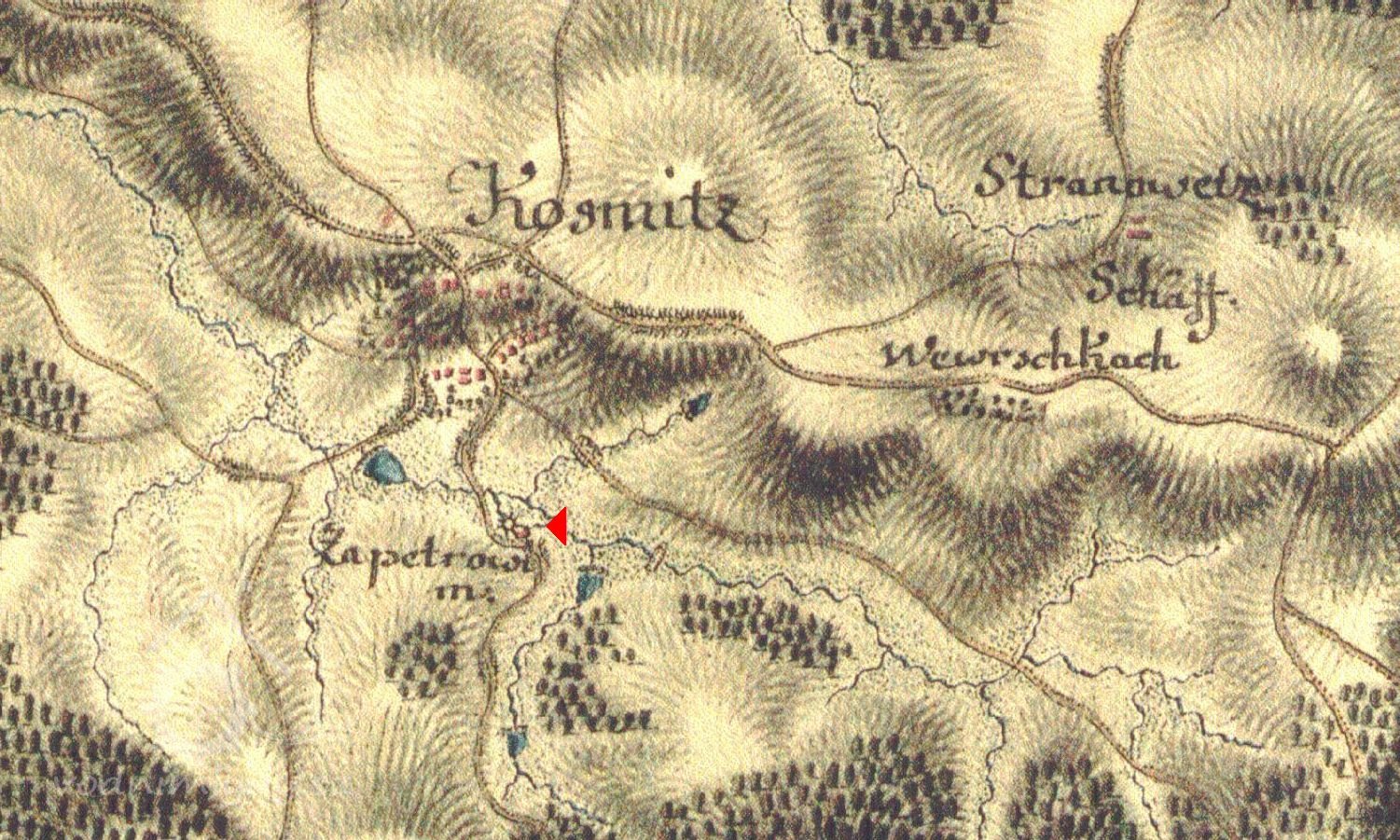 V místech, kde stojí chalupa z úvodní fotografie byl krátce na začátku 18. století mlýn. Prvotní informace o mlýně jsou z Historie svobodství v Kozmicích, kde je mlýn citován. Mlýn je uveden na mapě I. vojenského mapování. O padesát let později je zde již uváděn Jan Procházka, zapetrovský chalupník.