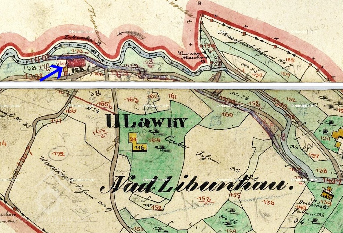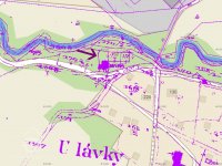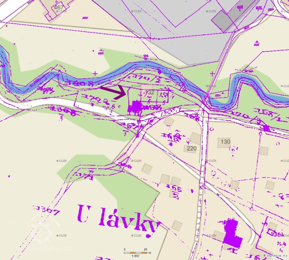 2) právo bezplatně přejížděti a přecházeti po můstku přes tuto strouhu vystaveném, též po cestě tak daleko jako cesta tato v katastrální mapě vyznačená se nachází. Povozem a potahem bezplatně jezditi a přecházeti a co se týče této cesty dál až k mlýnskému splavu čili jezu vedoucí, právo svobodně a po té samé choditi s kolečkem nebo s trakařem jeti a to nejen pro osoby držitele mlýna, nýbrž také pro povozy a lidi jim zjednané anebo v jeho službě jsoucí, tedy právo ježdění a chození do mlýna až ke splavu.