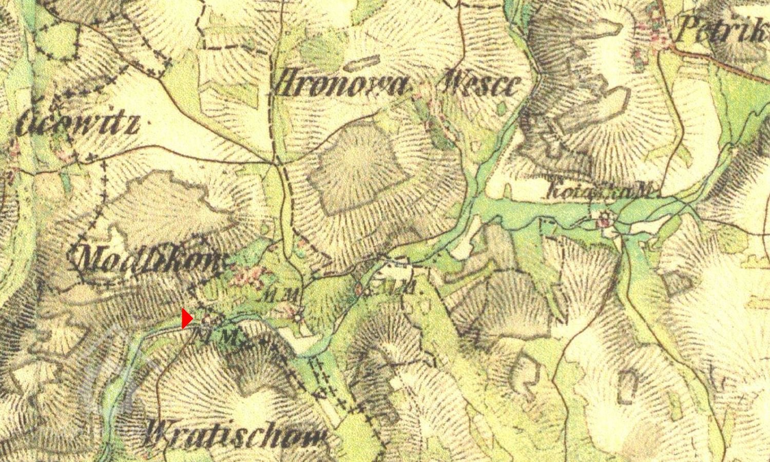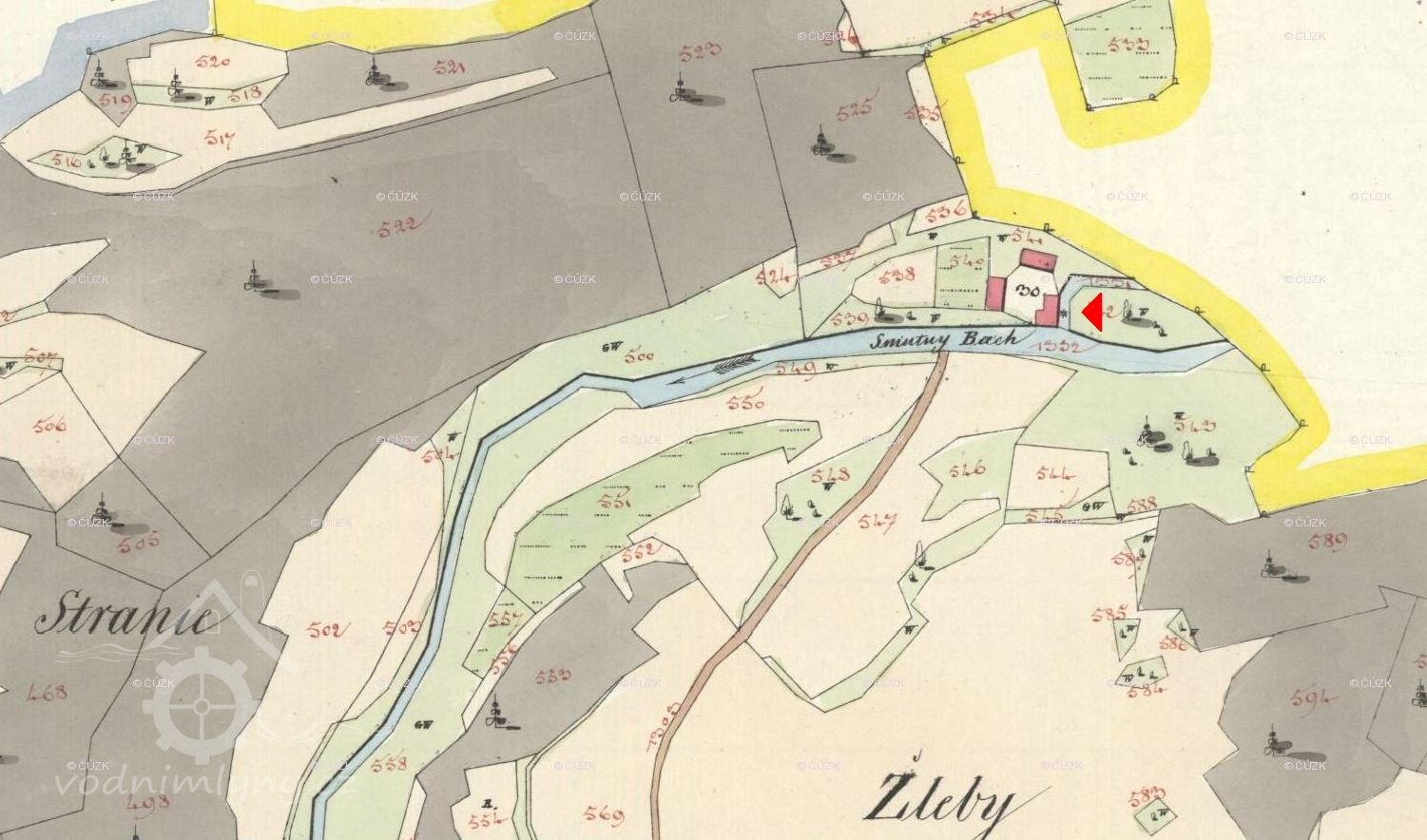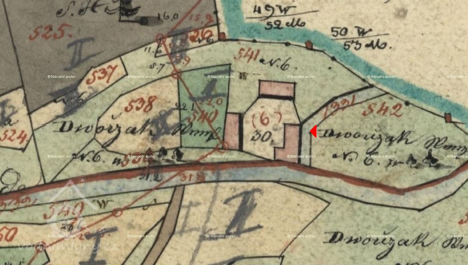 Popis1822: 1 kolo na svrchní vodu, prům. 5 m, 36 lopatek, průtok 300 l/s, spád 420-480 cm, výkon 14 HP