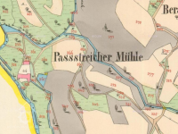 Passtreicherův (červeně) a Jankův (modře) mlýn, I. vojenské mapování, výřez, 1764-1768, © oldmaps.geolab.cz
