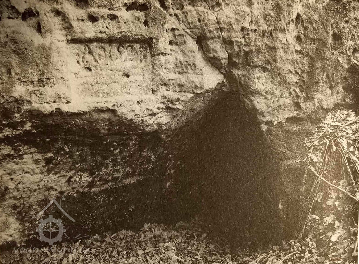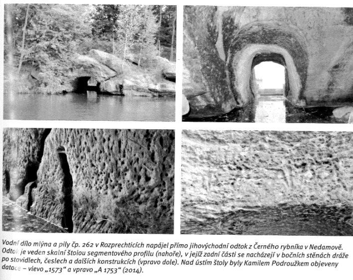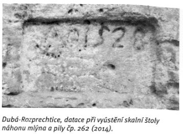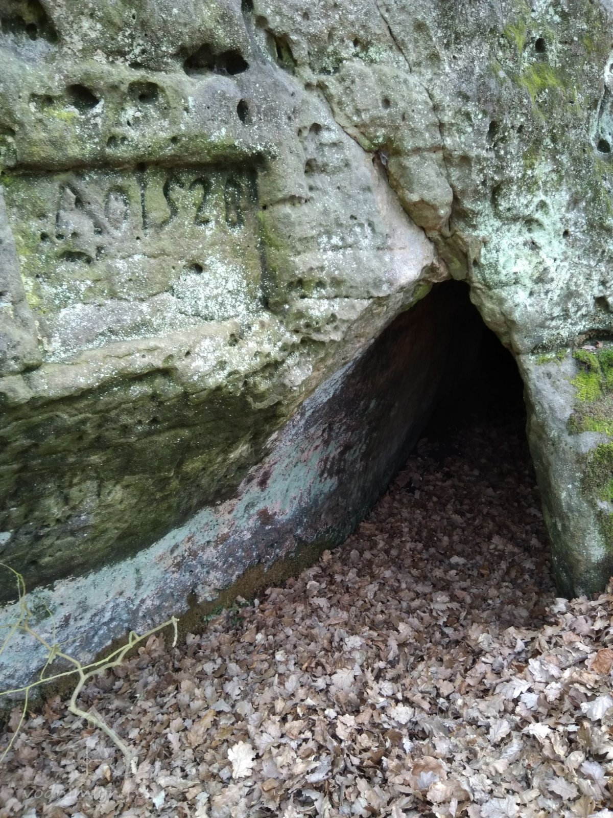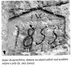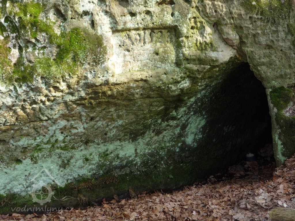 Letopočet 1528 na skále u tunelu (má to být nejstarší datace vodního díla u nás), 24.8.2011, © Vladimír Kraus, (Prvky na obrázku: náhon)
