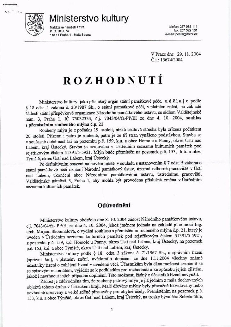 2008 přenesen na místo mlýna Týniště čp. 28 ve skanzenu v Zubrnicích.