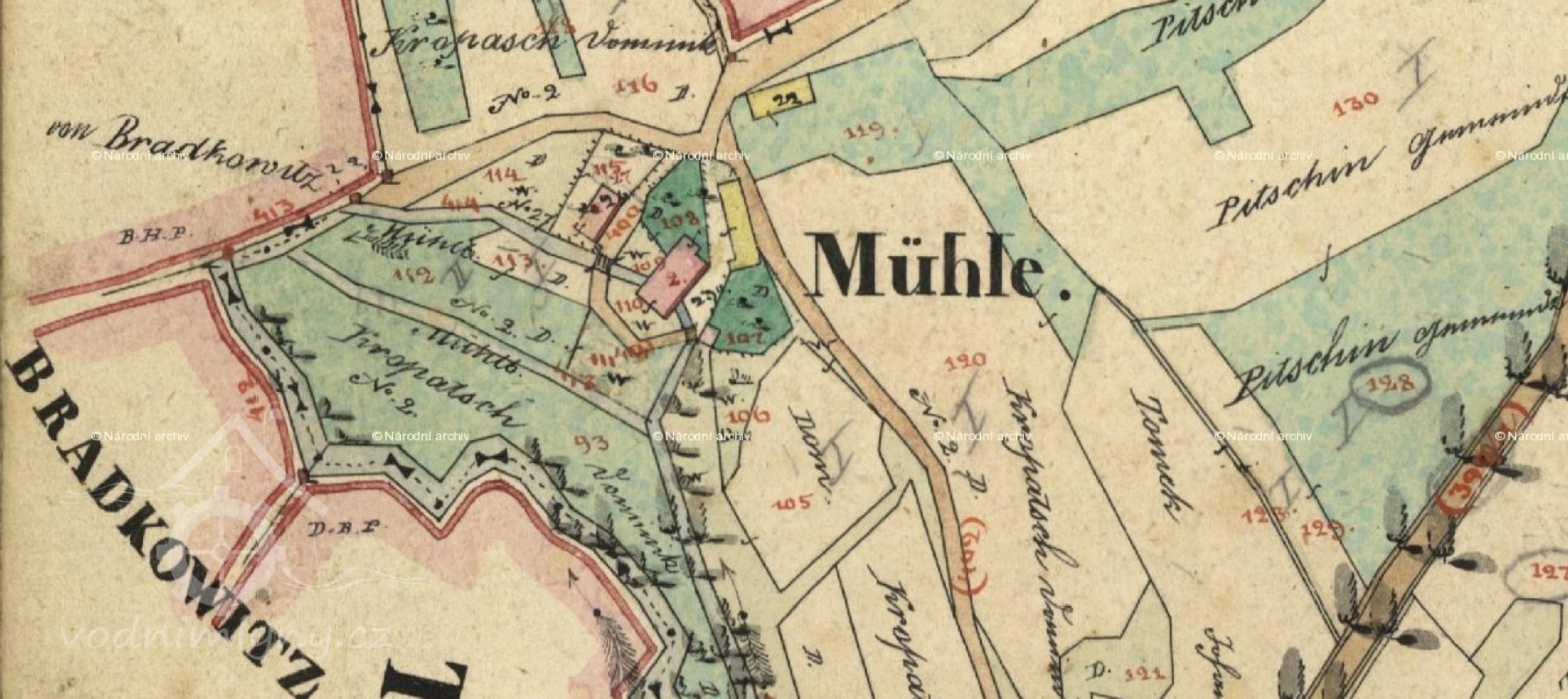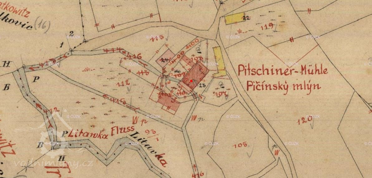 Pičínský mlýn, ode dávna zvaný, vedla rovná široká cesta k Pičínu, vlastnijí dosud 4 ha luk pod Loudilkou. Majitelé pak Damín, Eva Kropáčkovi, Tlosman J. a Skřivánek a dceru si vzal Svoboda Václav. Postavěl novou stodolu, maštale, strouhu rovnou, ode mlýna, vzorný hospodář. Syna měl učitelem. Mlýn převzal syn Gusta Svoboda, pořídil nové fran. stroje.