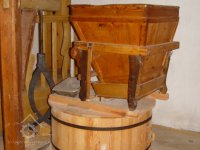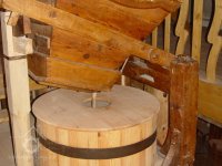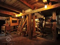 Pohled do interiéru mlýnice, 2012, © Ladislav Šumbera, (Prvky na obrázku: kamenné složení (šrotovací, mlecí), krupník, moučnice)