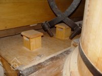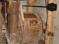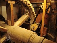 Paleční kolo a převod na holend, krupník, 2012, © Ladislav Šumbera, (Prvky na obrázku: transmise, řemenice, převody, mlýnská hranice, krupník)