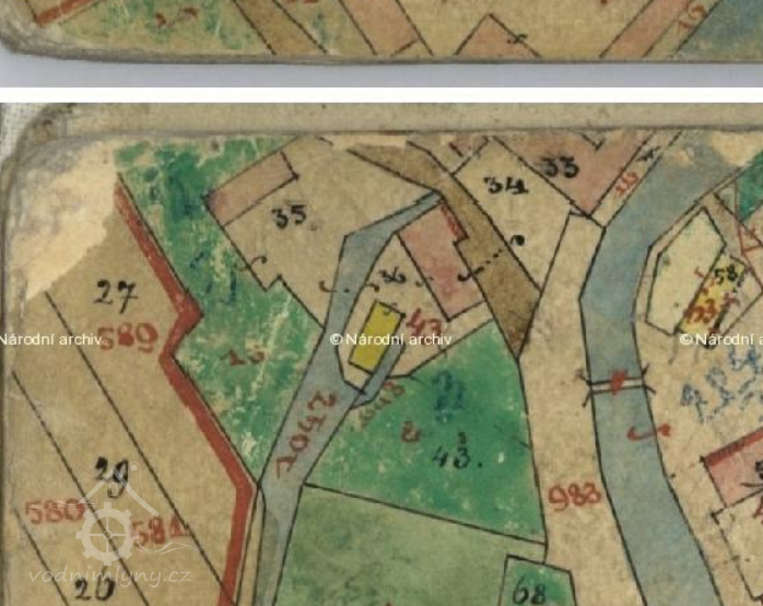 1654 Berní rula: Hořejší mlejn, mlejn byl na 2 kola, třetí stupní a volejna, nyní vše pustý