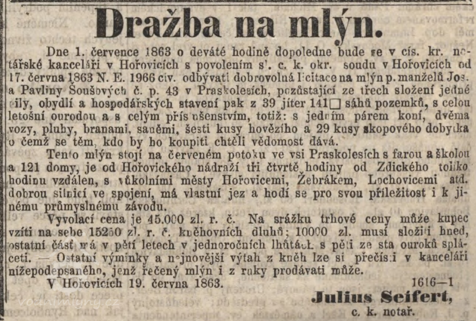 1863 - Josef a Pavlína Šoušovi. V tomto roce byla na mlýn dražba. (RR)